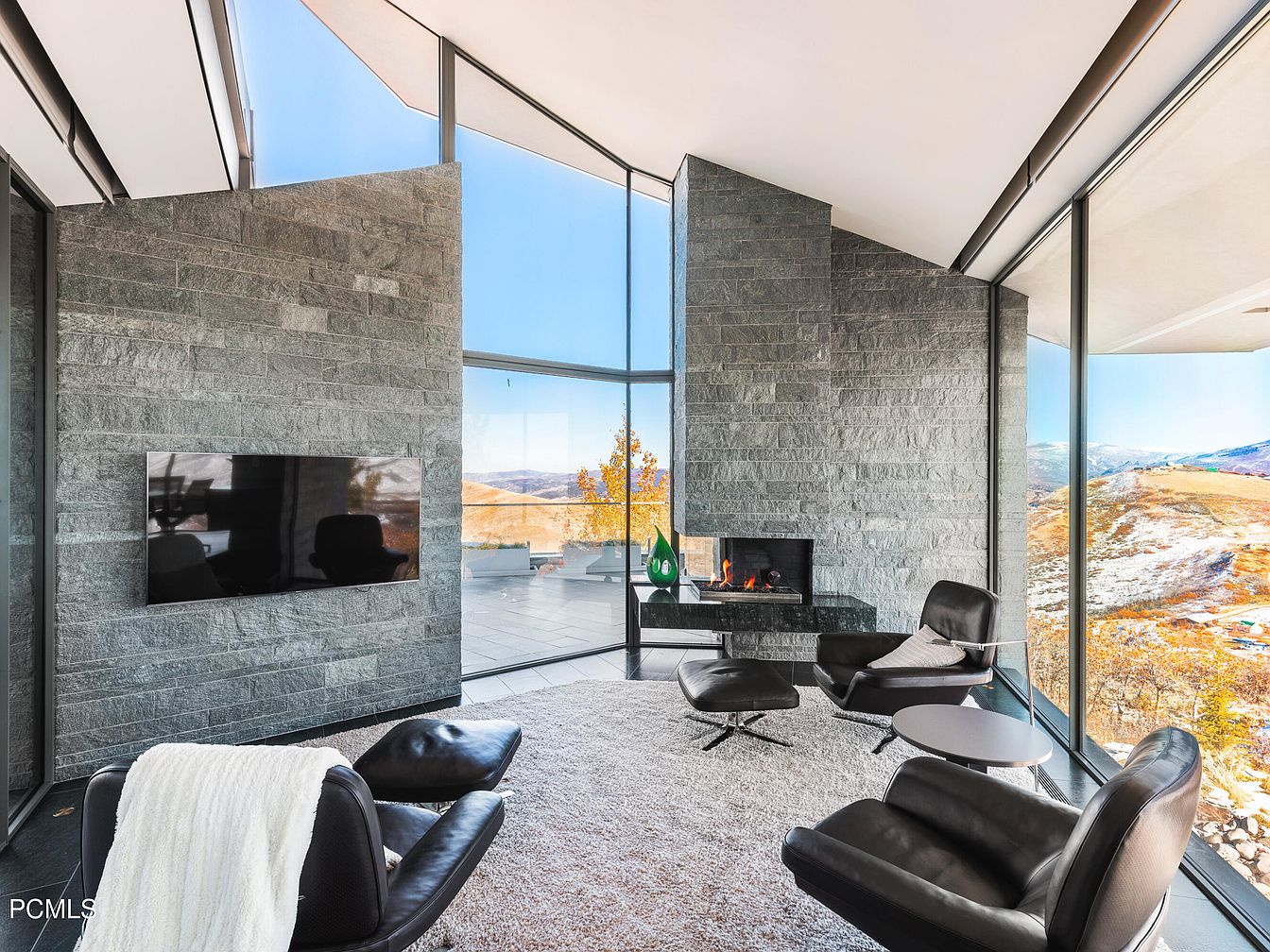 This striking living area showcases a seamless blend of comfort and sleek design. Expansive glass walls flood the room with natural light, accentuating the stunning mountain views. A sophisticated gray stone feature wall serves as a captivating backdrop to a modern fireplace, creating a cozy focal point. The minimalist furniture, featuring versatile black lounge chairs and a plush area rug, invites relaxation. A large, flat-screen TV is conveniently mounted for entertainment, while the contemporary table offers space for drinks or decor. The overall color scheme balances warm tones with natural elements, ideal for a family-friendly environment.