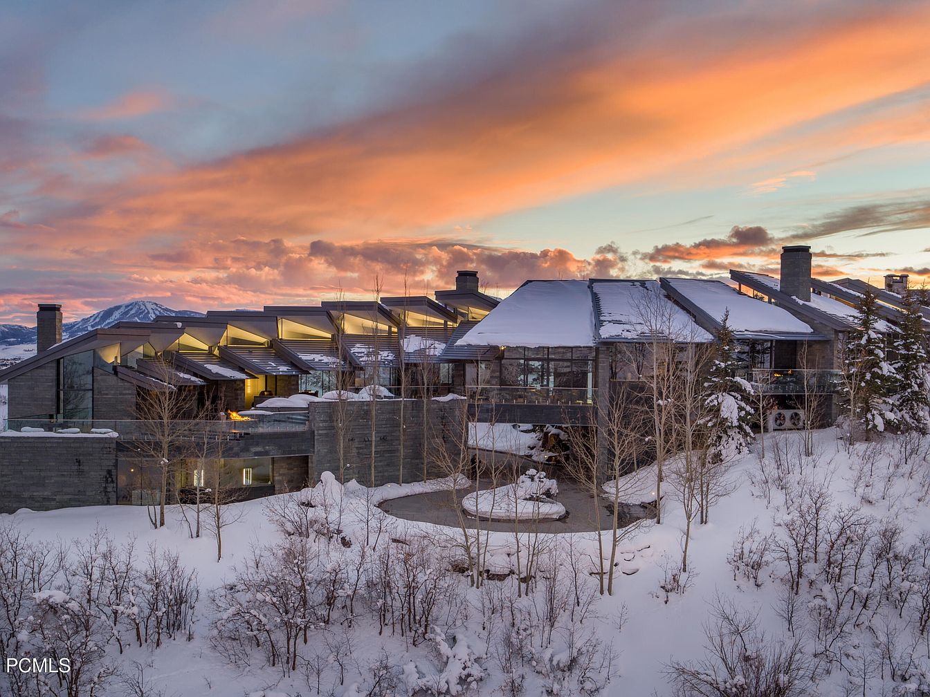 Set against a stunning backdrop of snow-capped mountains, this modern home showcases a blend of sleek architectural lines and natural materials. The structure is defined by broad, sloping roofs, accented with floor-to-ceiling windows that invite an abundance of natural light. A stylish stone façade complements the steel elements, harmonizing with the tranquil winter landscape. An inviting circular driveway leads to the entrance, framed by aspen trees dotting the snowy terrain. The home’s outdoor spaces offer a serene escape, ideal for family gatherings, all while providing breathtaking views of the surrounding mountains and vibrant sunset skies.