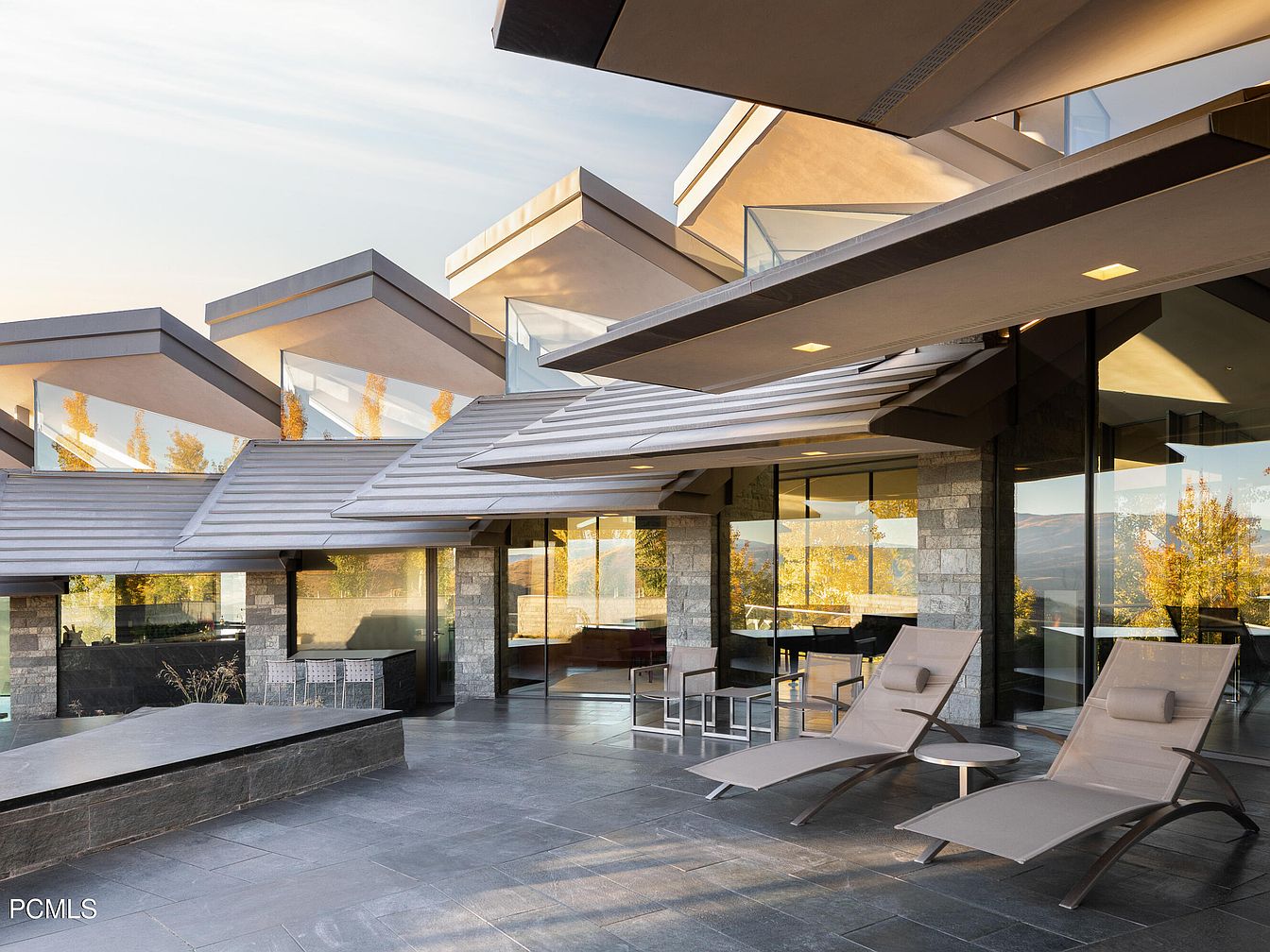 This outdoor living space blends modern design with stunning natural surroundings. It features sleek, asymmetrical rooflines that accentuate the contemporary architecture. The patio is adorned with large panes of glass that invite ample natural light, creating a seamless transition from indoors to outdoors. Comfortable lounge chairs are strategically positioned for relaxation, while elegant stone flooring adds a touch of sophistication. The muted color palette of grays and earth tones harmonizes with the landscape, promoting a sense of tranquility. This space is perfect for family gatherings, offering both aesthetic appeal and functionality—with ample room for entertaining.