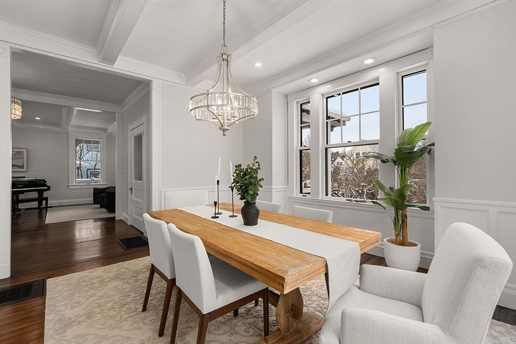 This inviting dining room combines modern elegance with a warm, family-friendly atmosphere. A striking wooden table takes center stage, complemented by plush white chairs, creating a refined yet comfortable dining experience. The space features large windows that flood the room with natural light, showcasing the beautiful trim and crown molding. A chic chandelier hangs above, adding a touch of sophistication. Accents like a lush green plant and a decorative centerpiece enhance the welcoming vibe. The adjacent room offers glimpses into a harmonious open layout, perfect for gatherings, while the rich hardwood flooring contributes warmth and character.