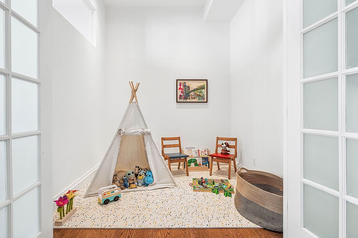 This charming kid’s play area is thoughtfully designed for both fun and comfort. A cozy teepee stands prominently, inviting imaginative play, while a colorful, speckled rug offers a soft surface beneath joyful activities. Two wooden chairs provide spots for storytime or quiet reflection, surrounded by children’s books and toys that inspire creativity. The neutral white walls create a bright and airy atmosphere, allowing playful elements to shine. Decorative flowers in unique planters add a touch of vibrancy, enriching the space. With ample natural light filtering through frosted glass doors, this area promotes a welcoming, family-friendly environment.