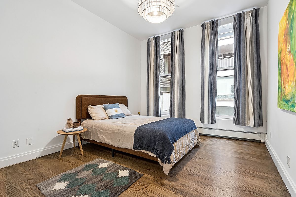 This inviting bedroom features a modern layout with a minimalist aesthetic, offering a serene space to unwind. The warm wood flooring complements the neutral color palette, creating a calm atmosphere. The bed, adorned with soft linens and a textured throw, stands as a focal point, while the bedside table provides functionality with a touch of style. Tall windows adorned with striped curtains allow natural light to filter through, enhancing the airy feel of the room. A vibrant piece of artwork adds a splash of color, creating visual interest and warmth, perfect for a cozy yet refined sanctuary.