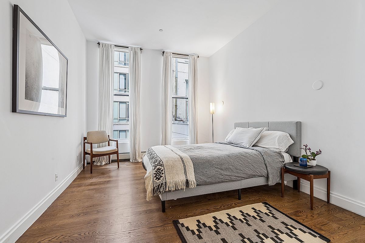 A harmonious blend of modern aesthetics and cozy comfort defines this master bedroom. Sunlight streams through expansive windows, draping the space in a warm glow, highlighting the seamless white walls and light hardwood floors. A soft gray upholstered bed, infused with plush bedding, invites relaxation, while a minimalist side table holds a small plant, adding a touch of nature. The gentle texture of a patterned rug anchors the room, complementing the clean lines of a stylish chair nearby. The subtle yet elegant floor lamp adds both symmetry and warmth, creating an inviting atmosphere perfect for unwinding.