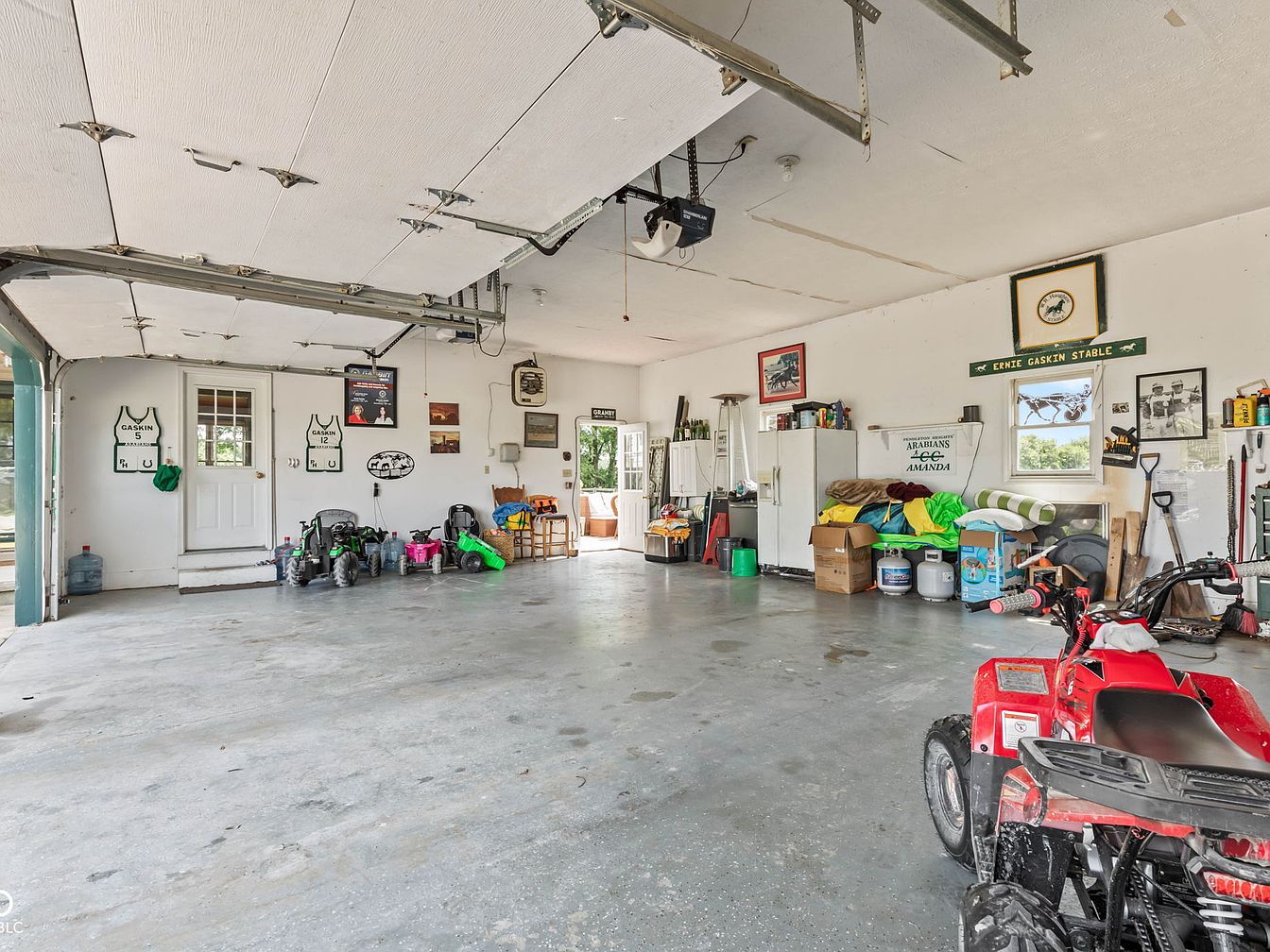 This expansive garage features a practical layout, designed for functionality and ample storage. The polished concrete floor offers durability, while the white walls enhance brightness and create an inviting atmosphere. Family-friendly highlights include space for recreational vehicles and outdoor gear, as well as a separate door leading to the main house for easy access. Decorated with wall-mounted storage and framed memorabilia, this garage blends utility with character. Notable elements like overhead shelving and a spacious workbench cater to hobbies, making it a perfect space for both projects and family gatherings while maintaining a clean, organized look.