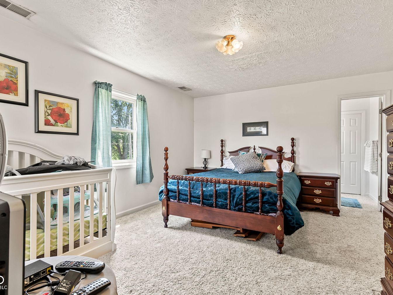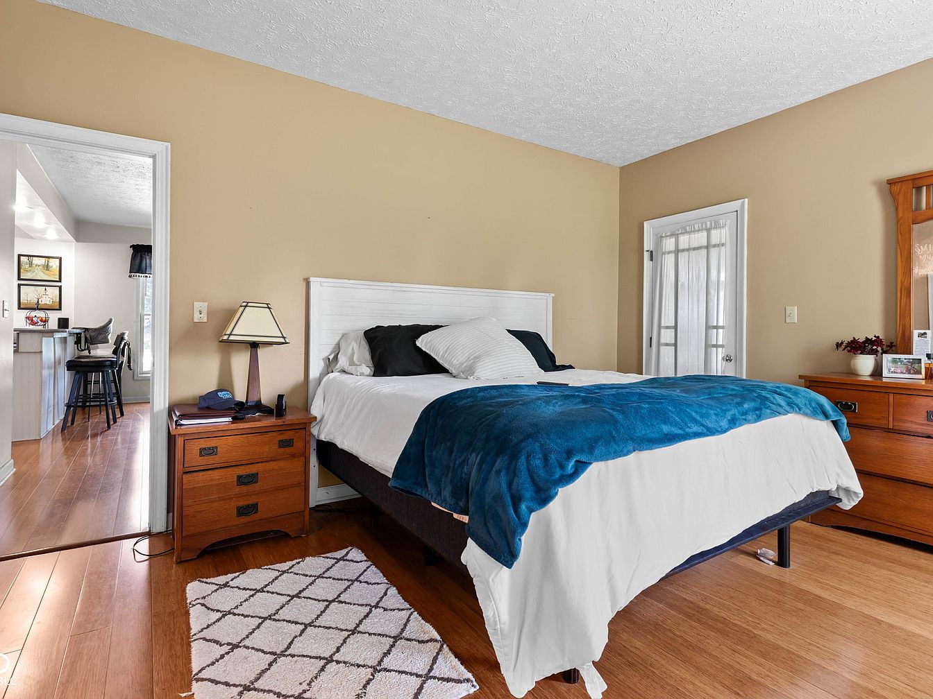 This inviting master bedroom combines comfort with style, featuring a spacious layout that promotes relaxation. The soft beige walls create a warm atmosphere complemented by rich wooden flooring. A plush navy throw drapes elegantly over the pristine white bedding, adding a pop of color. The room includes practical elements like a bedside lamp and a wooden nightstand with ample storage. Large windows allow natural light to flood in, brightening the cozy reading nook by the doorway. Thoughtful touches like the patterned area rug and classic wooden dresser enhance the room’s charm, making it a perfect family-friendly sanctuary.