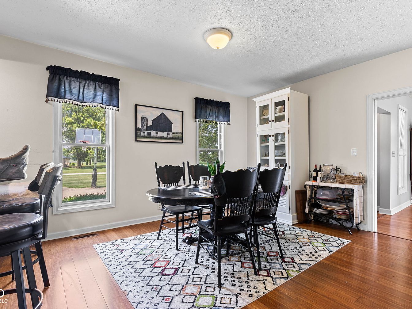 This inviting dining area features a round table surrounded by classic black spindle-back chairs, creating a cozy space for family gatherings. A vibrant, patterned rug adds warmth and character to the polished hardwood floors. Natural light streams in through large windows adorned with navy blue valances, enhancing the cheerful atmosphere. The room’s neutral walls complement the framed artwork and the stylish white cabinet, showcasing collectibles and dinnerware. A small side table offers additional storage and convenience. This well-designed layout is perfect for family dinners and entertaining guests, embodying a balance of comfort and functionality.