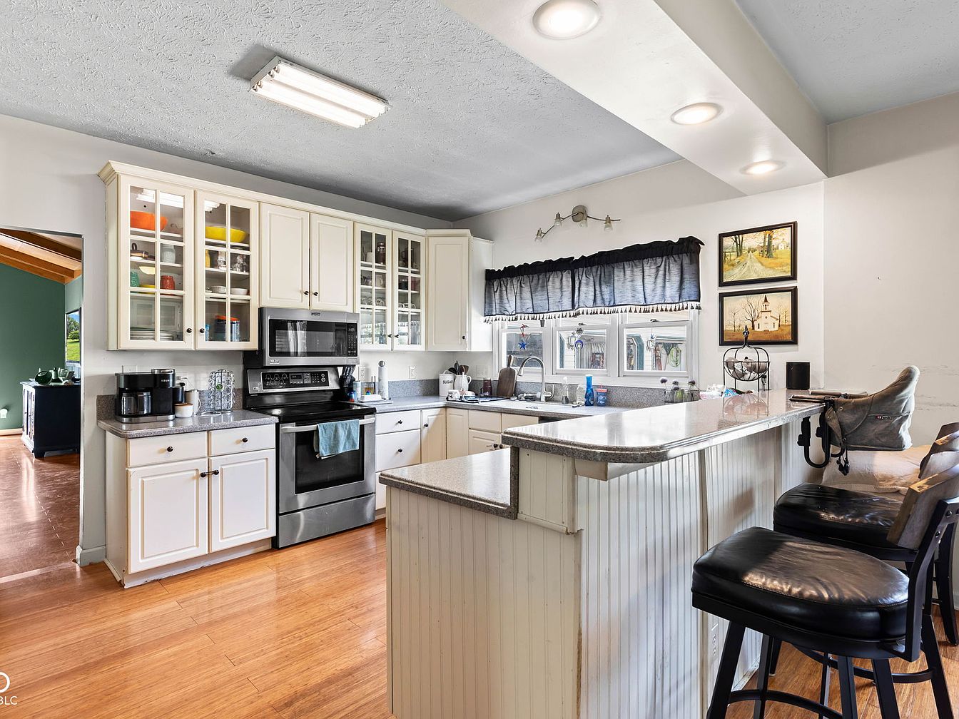 The kitchen features a spacious layout that encourages family interaction, with a seamless flow to the adjoining areas. White cabinetry contrasts beautifully with grey countertops, providing a fresh and clean aesthetic. Clever glass-front cabinets display vibrant dishware, adding a pop of color. The stainless steel appliances, including a modern microwave, enhance functionality and style. A breakfast bar with sleek black stools invites casual dining and relaxation. Natural light floods the room through the windows adorned with black valances, while hardwood floors add warmth, making this space not only practical but also inviting for family gatherings.