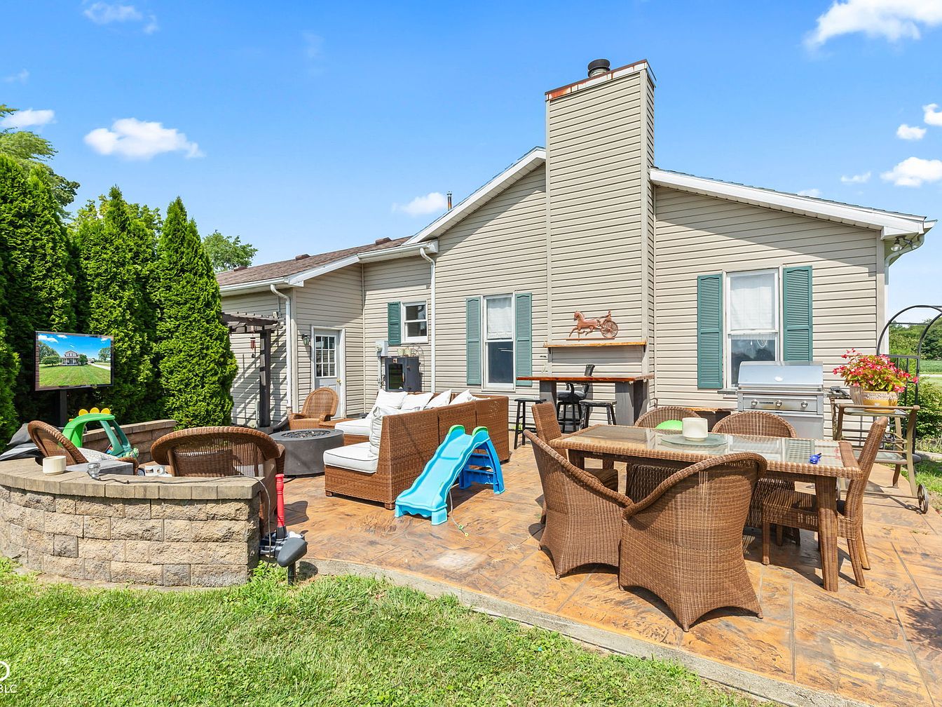 This inviting outdoor living space features a beautifully designed patio with a combination of seating areas perfect for family gatherings. A functional dining table is surrounded by stylish wicker chairs, while a cozy lounge area offers comfort with plush cushions. The warm brown tones of the furniture complement the neutral siding of the home and enhance the natural surroundings. A barbecue grill is conveniently positioned for easy access, and a charming fire pit creates an inviting atmosphere. Lush green trees provide privacy, and a mounted TV ensures entertainment, making this area ideal for relaxation and outdoor enjoyment.