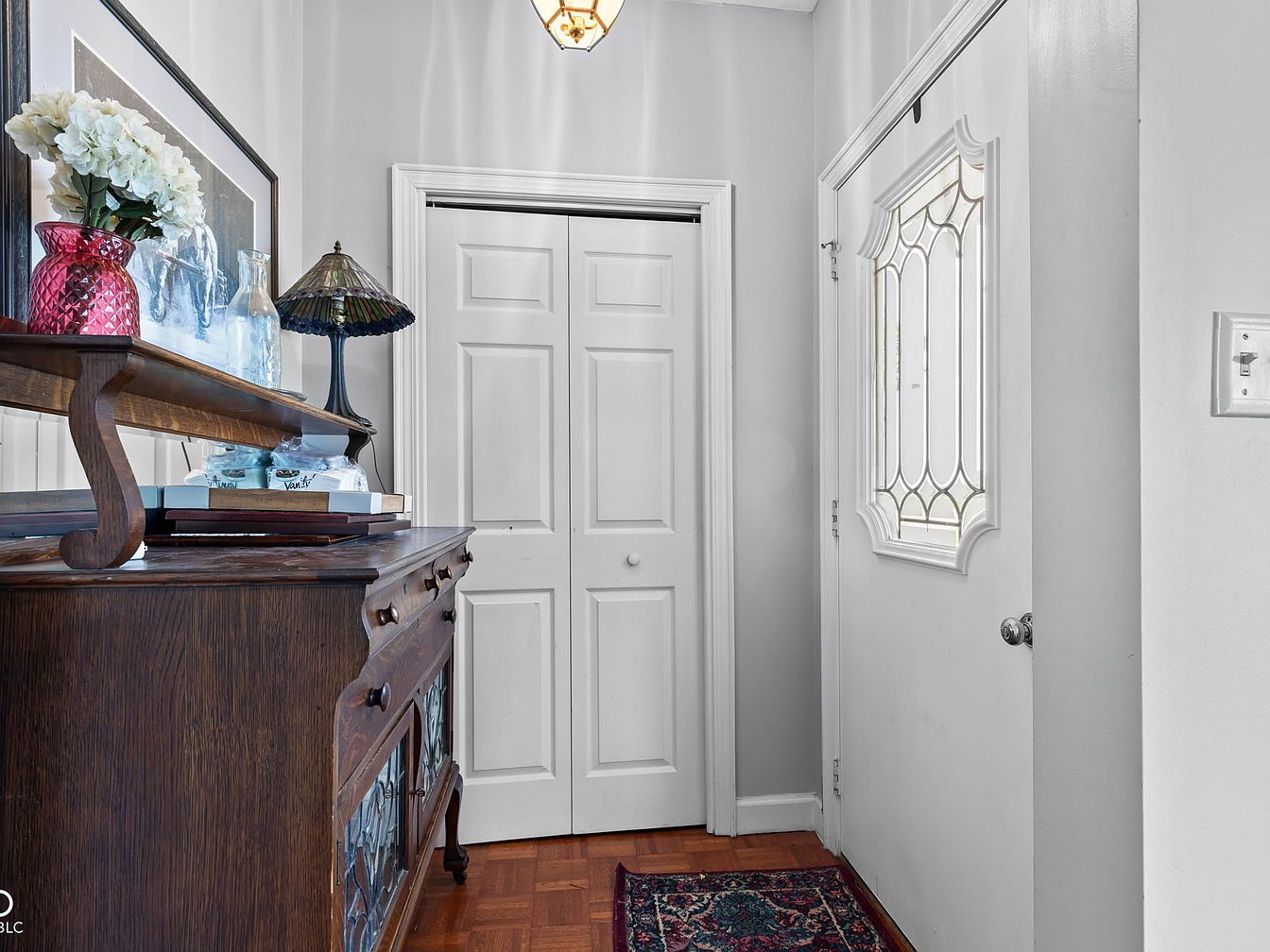 This charming entryway welcomes guests with a blend of elegance and warmth. Featuring a rich wooden console table adorned with a pink vase and a stained-glass lamp, it creates a vibrant focal point. The walls, painted in a soft gray, enhance the space’s brightness, while the classic hardwood floor adds warmth and texture. A decorative area rug underfoot introduces a splash of color, promoting a cozy vibe. Double doors lead to additional areas of the home, embodying a practical yet inviting layout. This space exemplifies family-friendly functionality, ensuring a delightful first impression for visitors.