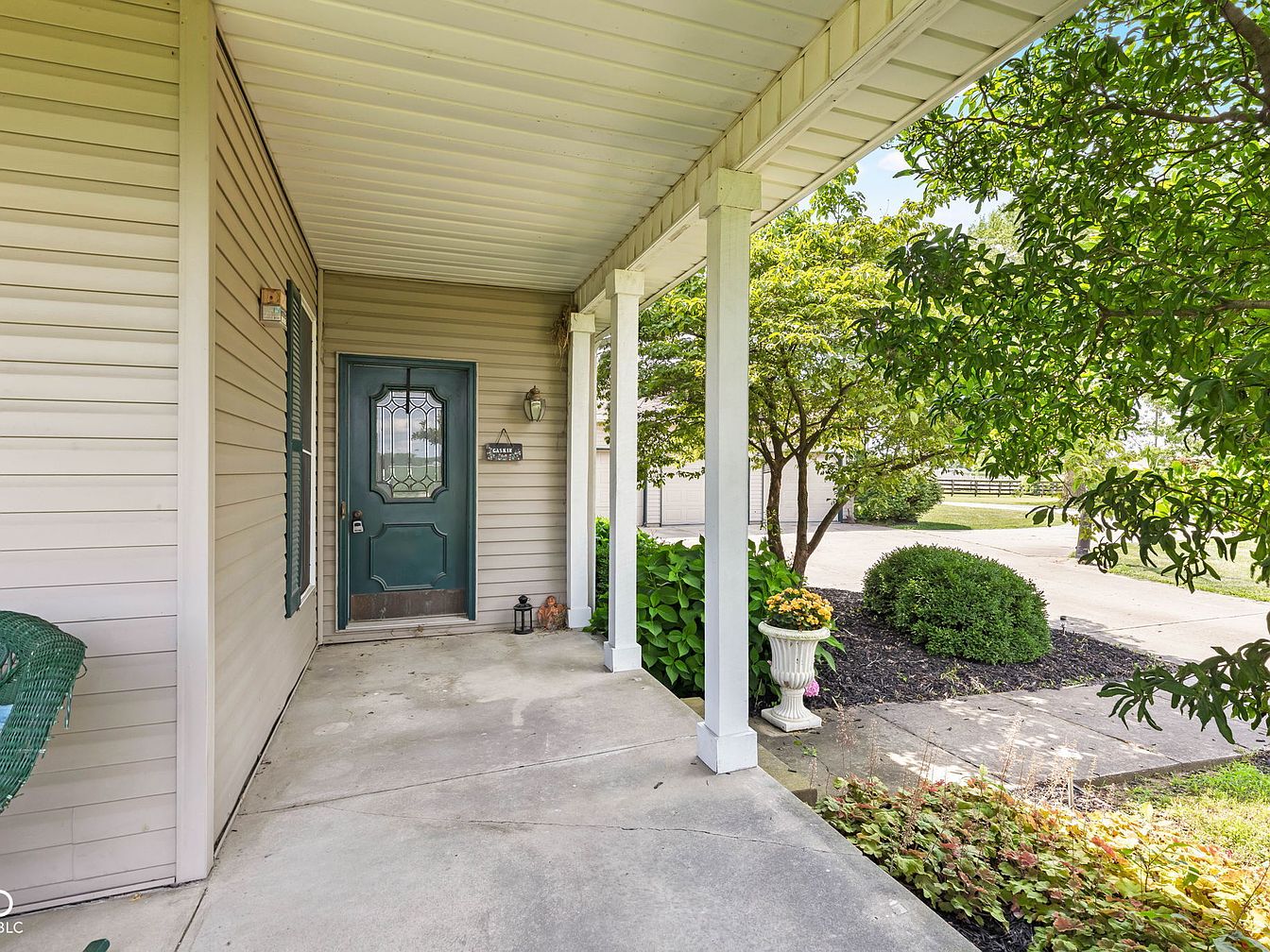 This charming front entry showcases a pleasing blend of functionality and aesthetics. The covered porch, supported by elegant white columns, invites family and guests to relax. Soft green hues of the door contrast beautifully with the light beige siding, enhancing curb appeal. Lush landscaping with vibrant flowers and well-maintained shrubs introduces a sense of tranquility. The concrete floor is easy to maintain, ideal for families, while the decorative lantern and welcoming sign add a personal touch. Ample shade from the surrounding trees creates a serene atmosphere, making it a perfect space for afternoon relaxation or social gatherings.
