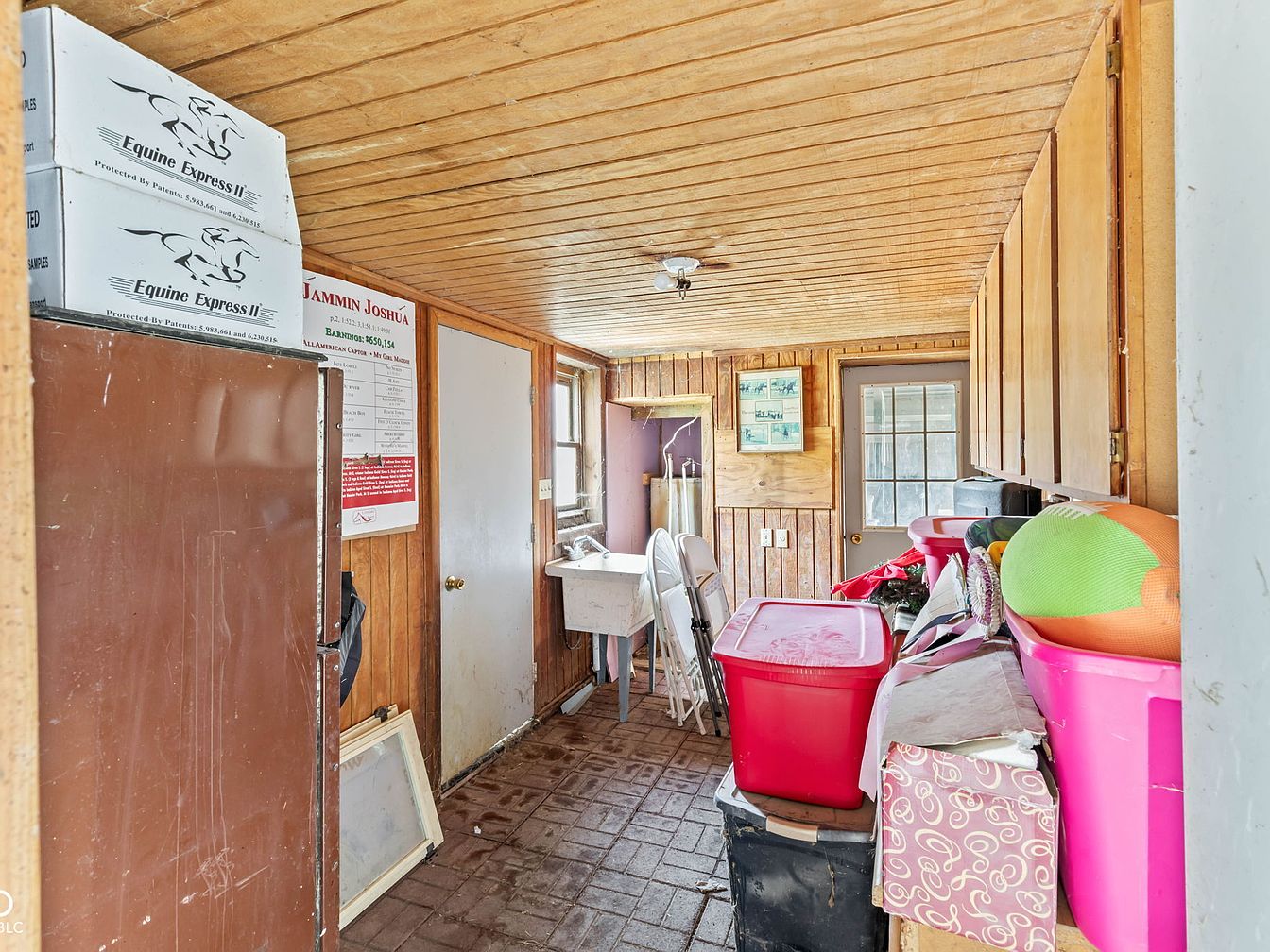 Featuring a practical utility room, this space blends functionality with a rustic charm. The wooden paneling and ceiling evoke a warm, inviting atmosphere, complemented by ample natural light streaming through the windows. Storage solutions are plentiful, with sturdy cabinets and various containers neatly arranged, providing an organized environment for family essentials. The tile flooring offers durability, making it ideal for high-traffic use. A designated area includes laundry fixtures, perfect for a busy household. The overall layout is designed for efficiency, ensuring that this multifunctional room meets every family’s needs while maintaining a cozy aesthetic.