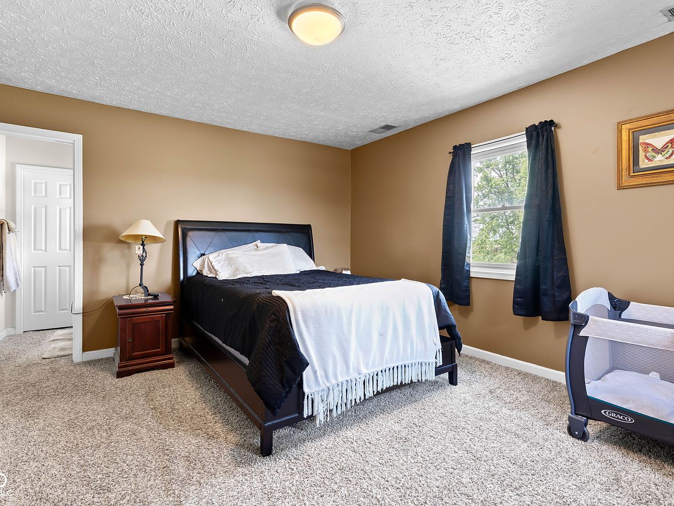 This inviting bedroom features a warm, earthy color palette with rich beige walls that create a tranquil atmosphere. A plush carpet provides comfort underfoot, while the dark wood furniture adds a touch of elegance. The centerpiece is a stylish bed with a modern headboard, adorned with crisp white linens and a textured throw. A charming nightstand holds a classic lamp, perfect for reading in bed. Blackout curtains frame the window, ensuring privacy while allowing natural light to filter in. A convenient crib indicates a family-friendly space, making this room an ideal retreat for parents and toddlers alike.