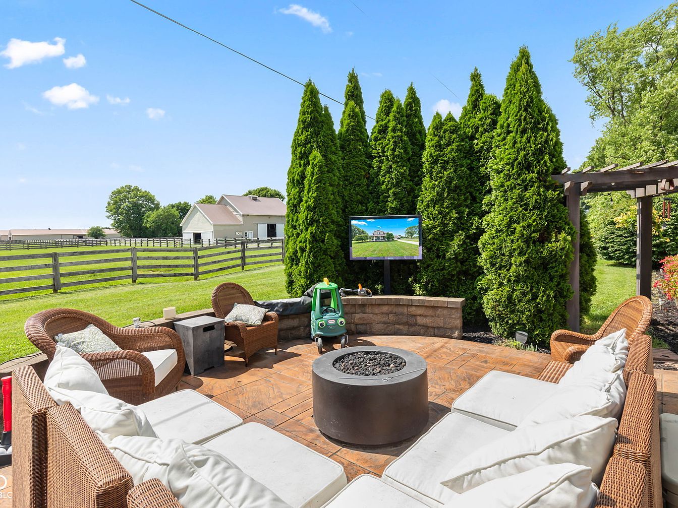 This inviting outdoor living area combines comfort and style, making it perfect for family gatherings and relaxation. The space features a circular fire pit surrounded by plush seating, ideal for cozy evenings under the stars. Lush, tall evergreens provide a natural privacy screen, enhancing the tranquil atmosphere. Its warm earth tones and textured patio flooring seamlessly blend with the lush green surroundings. A mounted TV caters to entertainment, while a cozy play area for children ensures endless fun. This well-designed outdoor haven is perfect for enjoying leisure time, BBQs, and unforgettable family moments.
