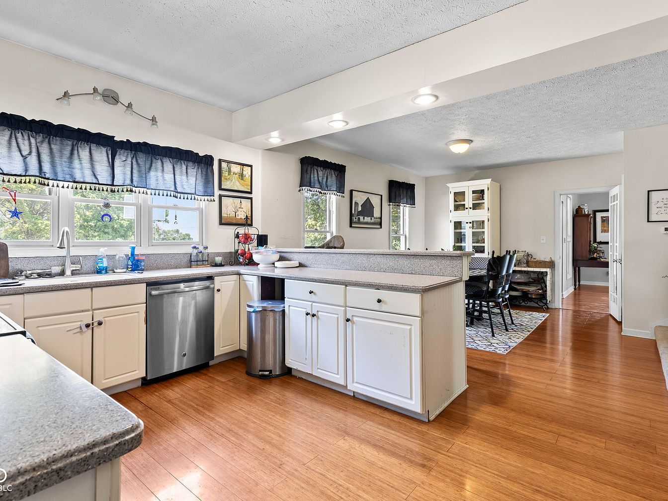 This inviting kitchen showcases an open layout with a seamless flow to adjacent dining areas. The warm bamboo flooring complements the light-colored cabinets, creating a bright and airy atmosphere. A spacious countertop offers ample workspace, ideal for culinary enthusiasts. Dark, soft fabric curtains frame the windows, allowing natural light to enhance the room. Decorative wall art and well-placed fixtures add character, while modern appliances ensure functionality. The cozy dining nook features stylish black chairs against a patterned rug, making it perfect for family gatherings. Overall, this kitchen blends comfort and style, ideal for everyday living and entertaining.
