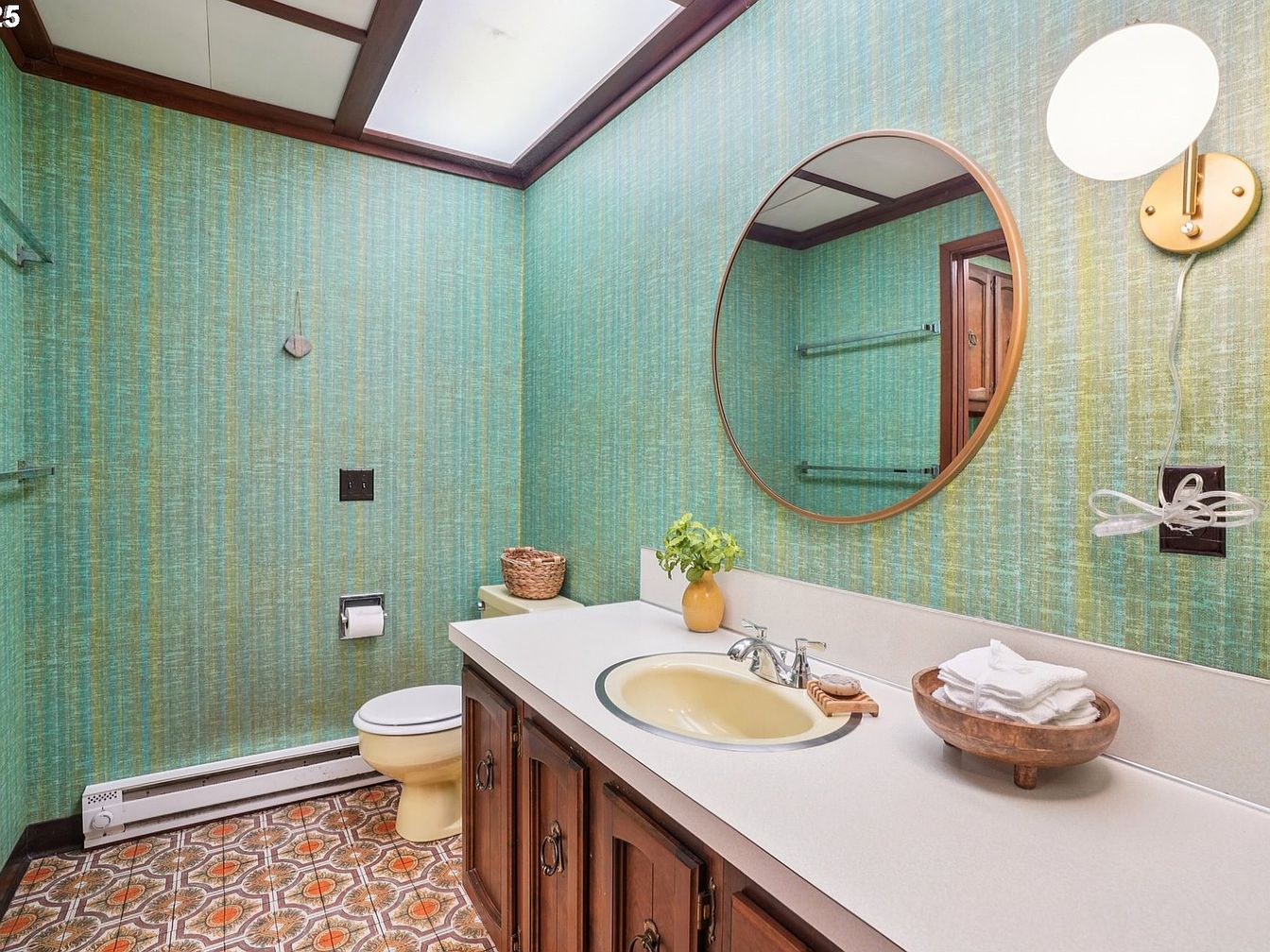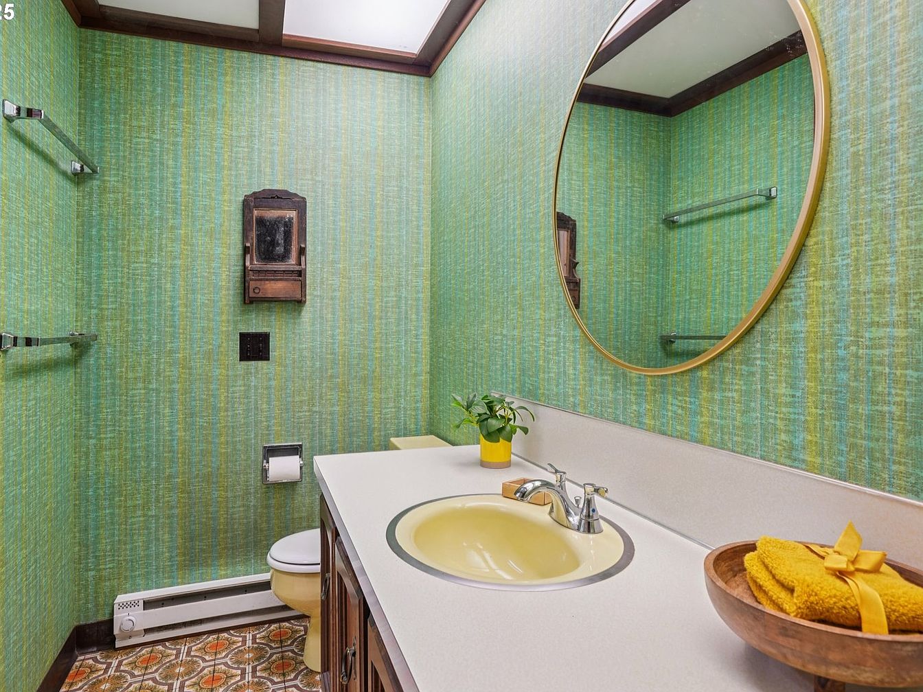 A charming bathroom with a nostalgic mid-century flair, featuring textured green and yellow wallpaper that energizes the space. The large circular mirror above the countertop adds depth and reflects ample natural light from the skylight, making the room feel bright and roomy. A classic yellow sink and toilet coordinate with vintage patterned floor tiles, completing the playful color palette. Modern chrome towel bars provide convenience for busy families, while a wooden tray with yellow towels and a small potted plant add a homey, welcoming touch. This bathroom blends retro style with functional features, creating an inviting space for family members of all ages.