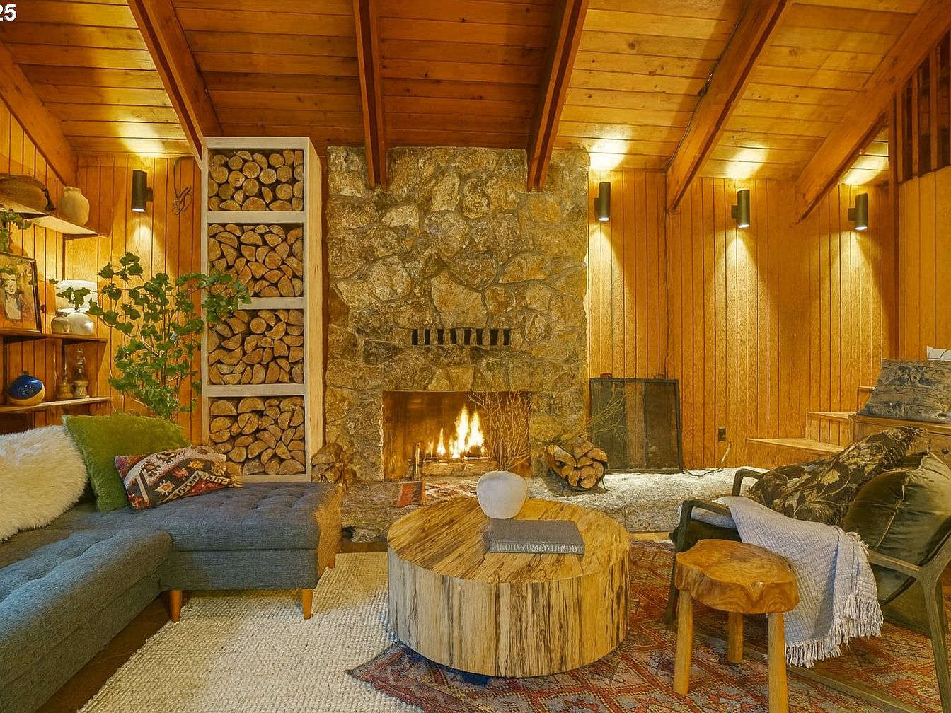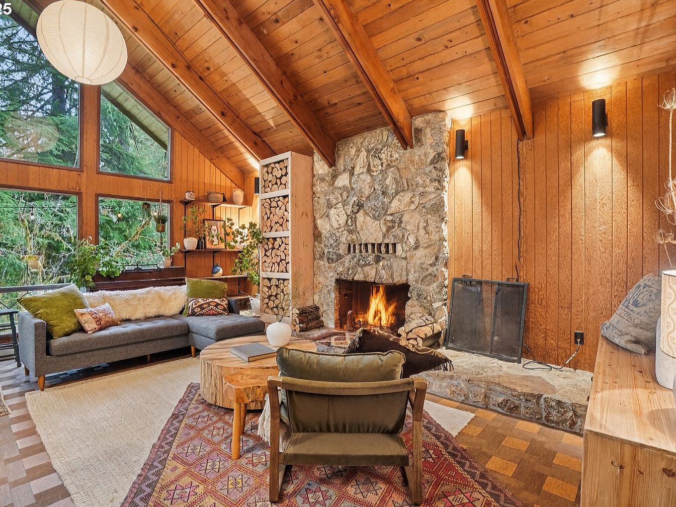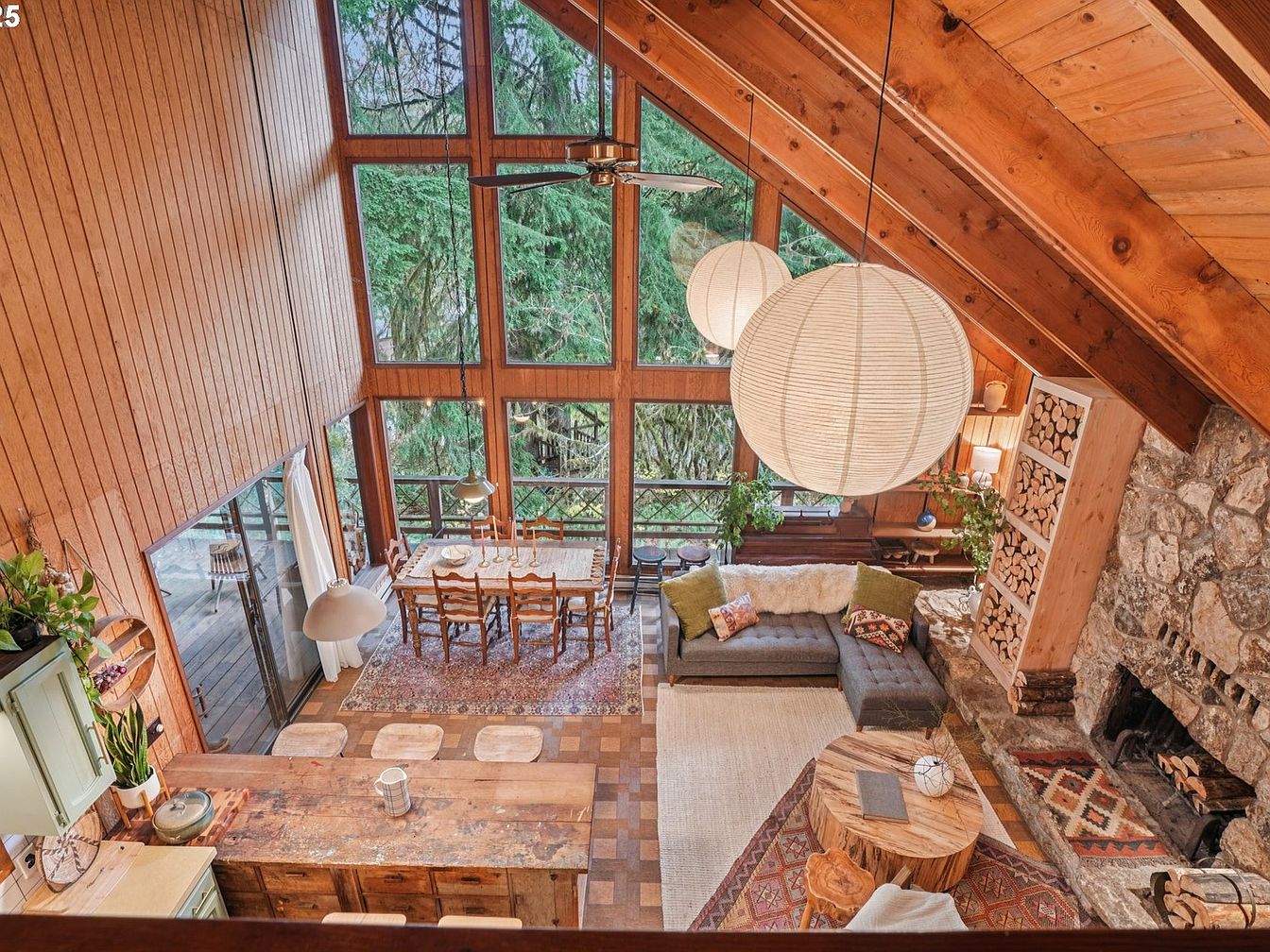 A warm, inviting space with vaulted ceilings and expansive windows framing a lush, forested backdrop. Natural wood paneling and exposed beams create a cozy, rustic ambiance, complemented by an impressive stone fireplace and stacked firewood that enhance the cabin feel. The living room features a plush sectional sofa with textured cushions and a round, wooden coffee table, perfect for family gatherings. The adjoining dining area, anchored by a large table and vintage rug, offers seating for eight, making it ideal for shared meals. Hanging globe lights, indoor plants, and soft earth tones blend comfort with natural beauty for an inspiring, family-friendly retreat.