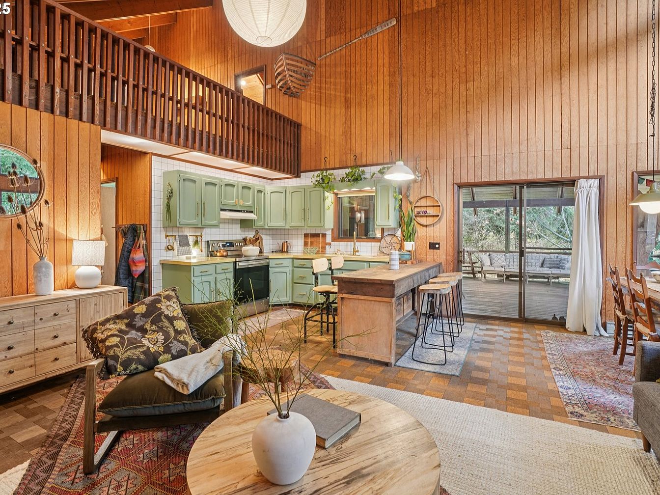 A warm, inviting open-plan kitchen and living space is the heart of this home, where natural wood paneling complements sage green cabinetry and rustic accents for a cozy, nature-inspired retreat. High vaulted ceilings and large sliding glass doors fill the room with light, seamlessly blending indoor and outdoor living. Family-friendly features include durable furnishings, a generous kitchen island perfect for casual dining or homework, and a spacious dining area ideal for gatherings. A mix of vintage rugs, soft neutral tones, and comfortable lounge seating create a relaxed, welcoming environment suitable for daily living or entertaining.