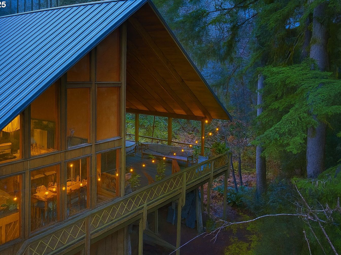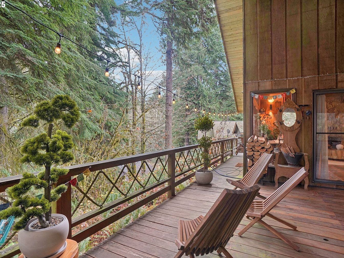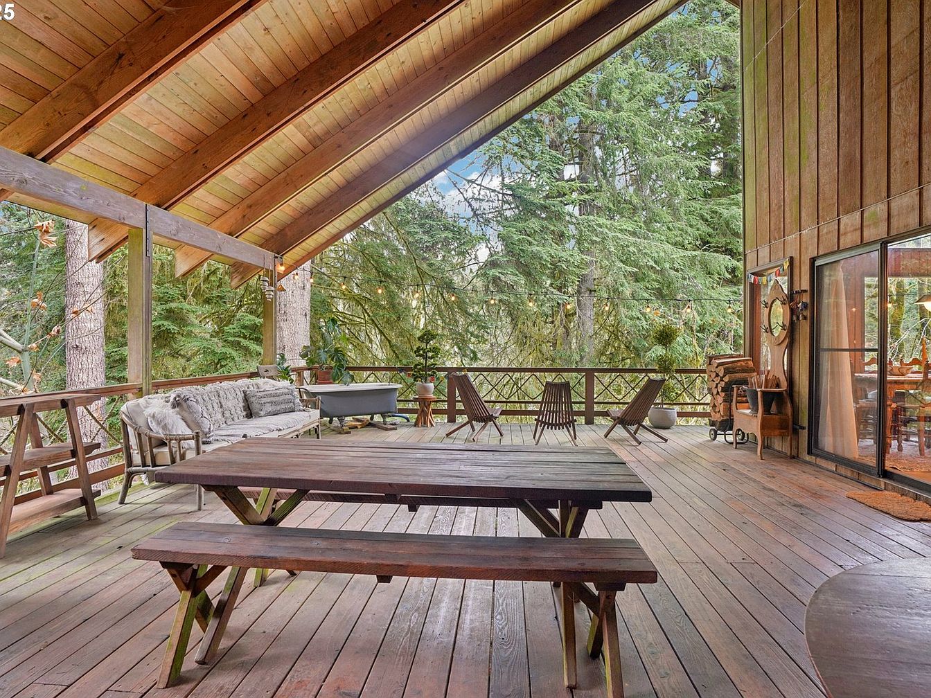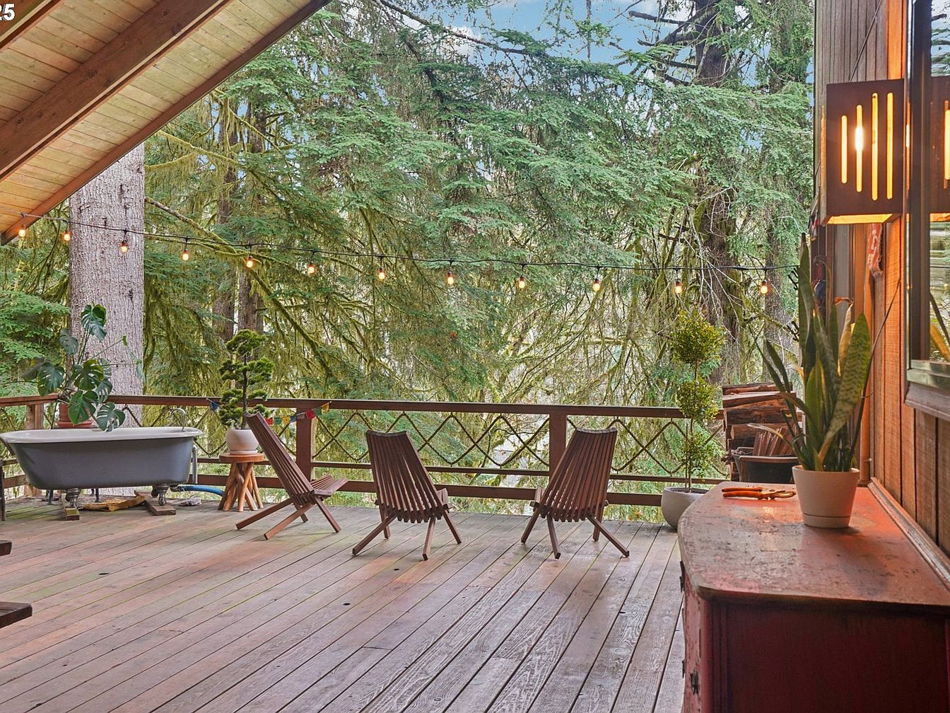 Expansive covered deck merges seamlessly with the lush forest surroundings, perfect for family gatherings and outdoor living. The rich, natural wood tones of the flooring, rafters, and walls set a warm, rustic ambiance. A spacious picnic table and cozy cushioned sofa provide ample seating for group meals or relaxed conversation, while lounge chairs invite quiet moments overlooking the treetops. String lights add a cheerful, welcoming glow for evenings. Sliding glass doors create easy flow between indoor and outdoor spaces, and neatly stacked firewood hints at cozy nights. Potted plants and thoughtful touches foster a welcoming, family-friendly environment for all ages.