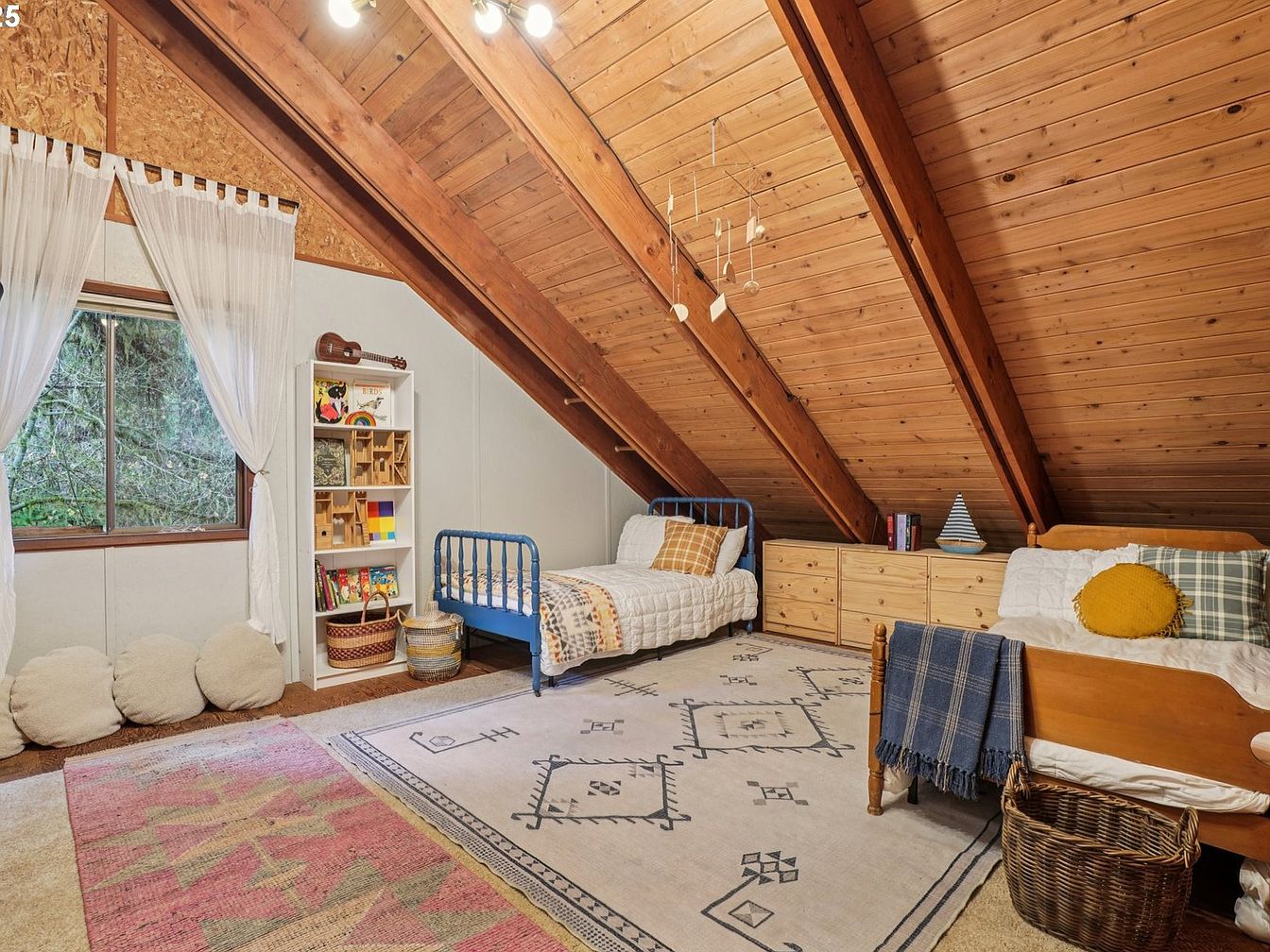 This inviting attic bedroom features sloped wooden ceilings, creating a warm and rustic atmosphere ideal for children. Two beds, spaced to promote sharing and connection between siblings, are decorated with cheerful pillows and simple bedding. Natural wood dressers offer ample storage, while a whimsical mobile and open shelving filled with colorful toys and books provide engaging details. Soft rugs in gentle patterns and neutral tones offer a comfortable play area, and sheer curtains let in natural light, enhancing the cozy ambiance. The thoughtful layout and plush floor cushions by the window make this room both functional and family-friendly.
