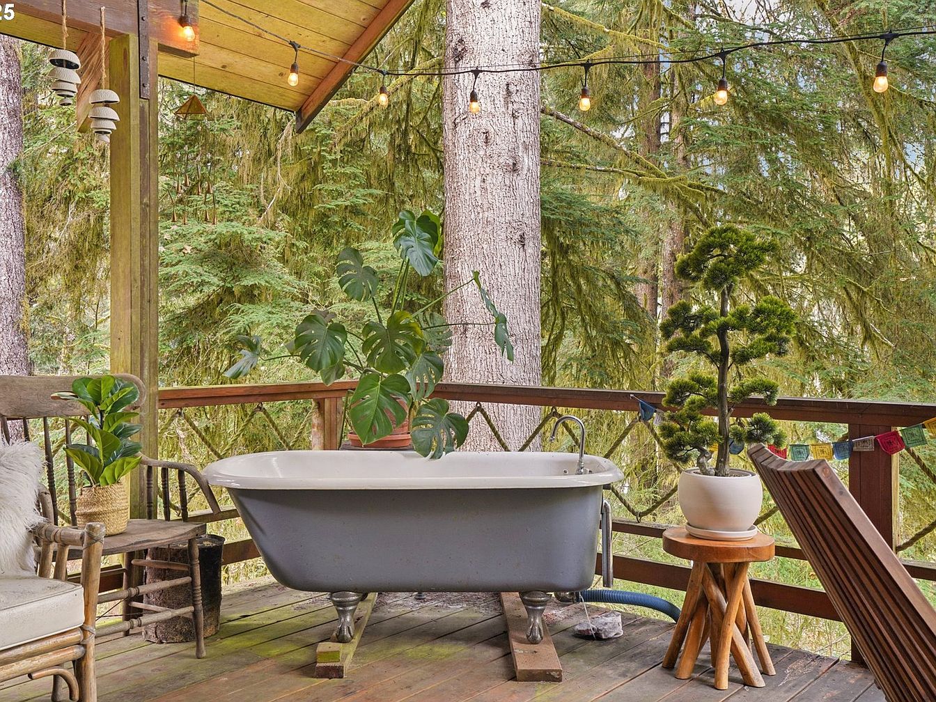 This covered deck features a charming clawfoot bathtub as a focal point, perfect for relaxation while surrounded by nature. Wooden elements in the ceiling, railing, and weathered floorboards create a warm, rustic aesthetic. Cozy, family-friendly seating is offered by a cushioned bamboo chair, accompanied by a furry pillow and a sturdy wood side table. The space is punctuated with lush potted plants, enhancing its calming, eco-conscious atmosphere. String lights wind overhead, adding both safety and ambiance for evening family gatherings. Natural tones blend seamlessly with the forest backdrop, making it an inviting spot for both adults and children.