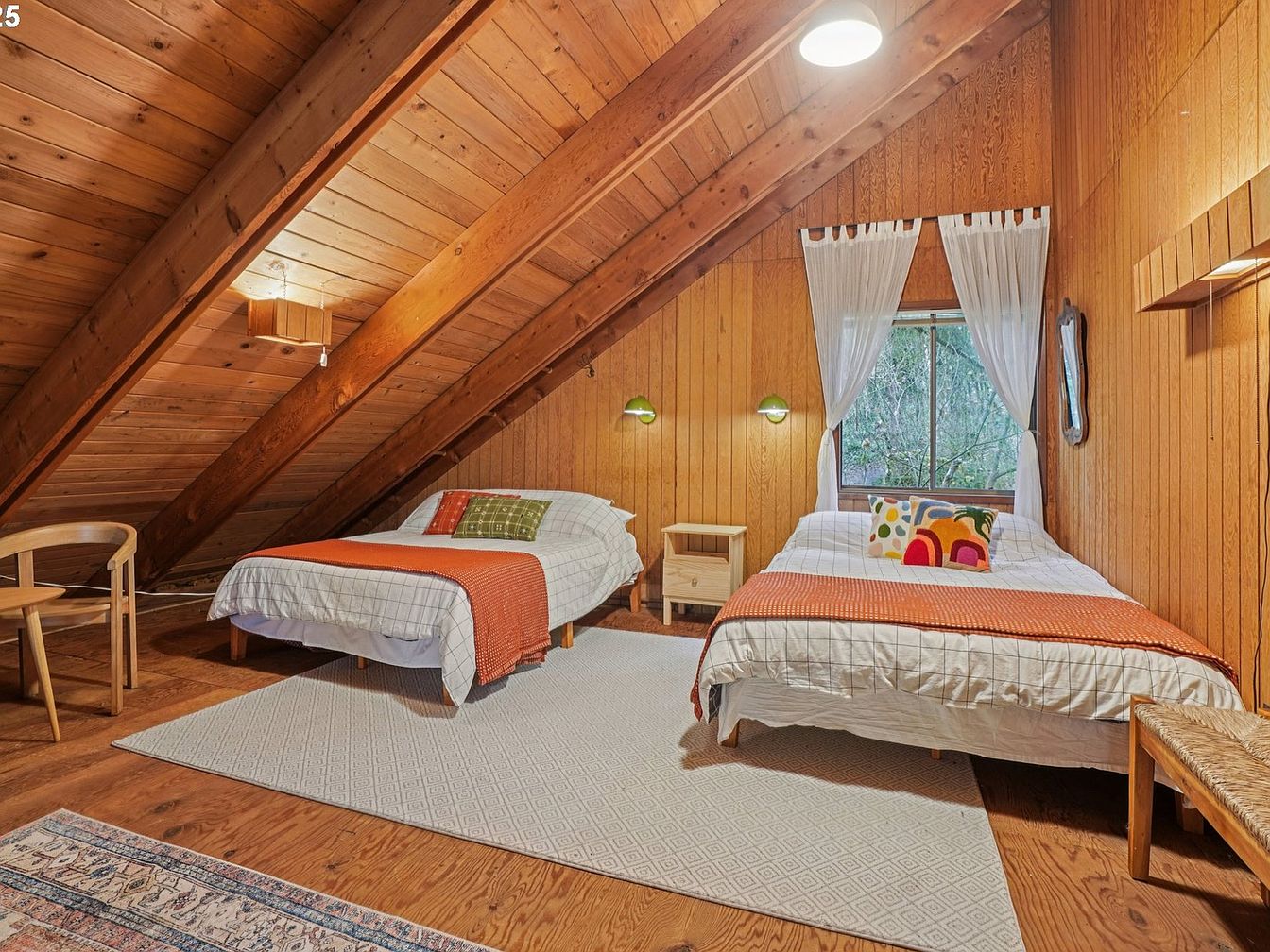 A warm and inviting attic bedroom features natural wood paneling and exposed beams, creating a rustic yet modern retreat. Two double beds, each adorned with crisp white linens and vibrant orange throws, offer plenty of sleeping space for families or guests. Soft ambient lighting and a large area rug add comfort and coziness. The window, dressed with sheer white curtains, frames green views while allowing natural light to fill the room. Playful accent pillows and a blend of simple wooden furnishings, including a minimalistic nightstand, chair, and bench, complete this family-friendly, restful hideaway under the eaves.