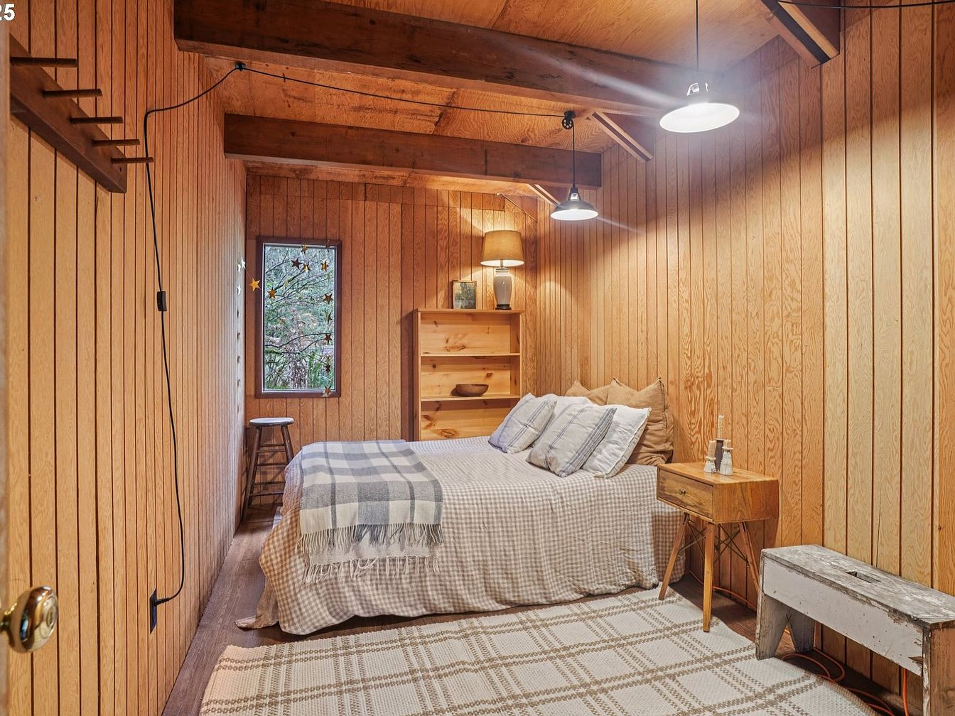 Warm wood paneling lines the walls and ceiling, complemented by exposed beams that add character and invite a cozy cabin atmosphere. The large bed, dressed in soft checkered linens with an assortment of neutral pillows, makes for a family-friendly sleeping space perfect for comfort and relaxation. Simple, functional furniture—a wooden nightstand, bench, and compact bookshelf—offer practicality without clutter. The soft, plaid area rug enhances the space’s welcoming feel, while a small window introduces natural light and a view of greenery, connecting indoors with outdoors. Pendant lighting and a table lamp provide gentle, ambient illumination ideal for winding down.