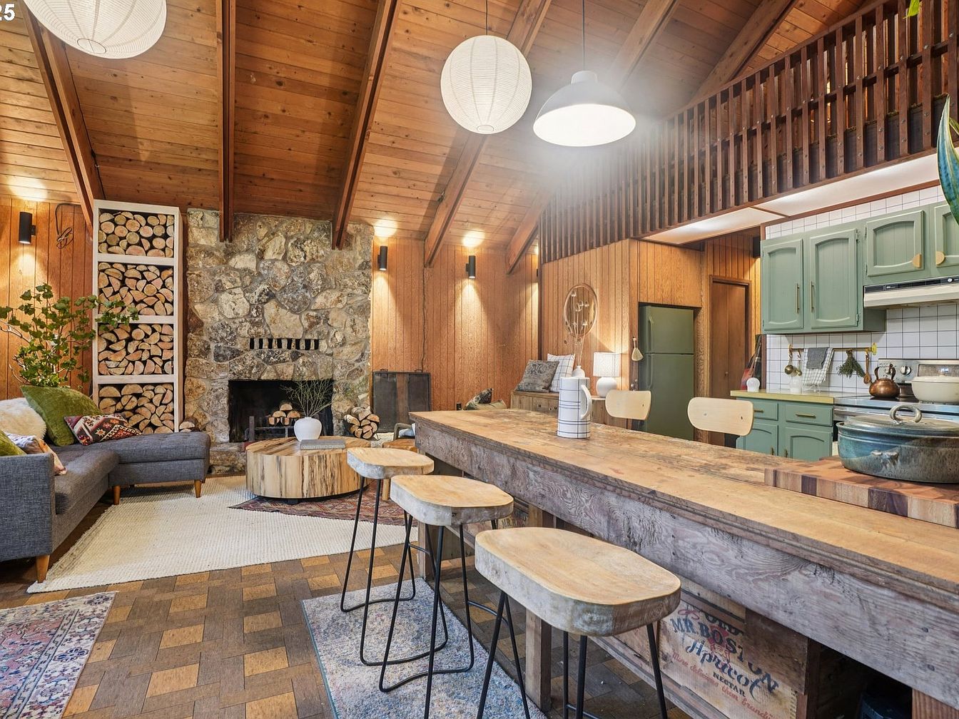 A welcoming open concept living room and kitchen, featuring soaring vaulted wooden ceilings with exposed beams and warm wood-paneled walls. The living area centers around a large, stone fireplace flanked by tidy shelves stacked with firewood, creating a cozy environment perfect for family gatherings. The space blends rustic and modern elements, including a spacious grey sectional, geometric rugs, and live edge wooden coffee and bar tables. The kitchen’s sage green cabinetry and white tile backsplash offer a fresh contrast, while the large island with natural wood stools encourages communal meals and casual seating, making it ideal for family-friendly entertaining.