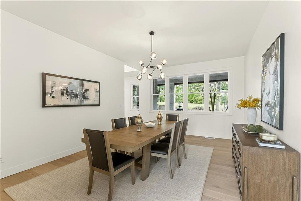 This elegant dining room features a spacious wooden table surrounded by chic upholstered chairs, making it perfect for family gatherings or entertaining guests. The light wood flooring complements the warm color scheme of the room, while the neutral white walls enhance the airy atmosphere. A striking, modern chandelier illuminates the space, adding a contemporary touch. Large windows invite natural light and offer serene views of the outdoor landscape, creating an inviting ambiance. A stylish sideboard showcases decorative accents and provides additional storage, ensuring functionality while maintaining a clean and organized look, ideal for family-friendly living.