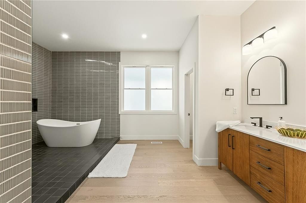 This spacious bathroom features a sleek, contemporary layout that harmoniously blends style and functionality. The centerpiece is a freestanding tub nestled against an accent wall of textured gray tiles, creating a serene bathing area. Light floods through large windows, enhancing the airy ambiance. A double vanity with rich wooden cabinetry offers ample storage while maintaining a minimalist aesthetic, complemented by elegant black fixtures. The warm, light-toned wooden flooring adds a touch of comfort, making this space inviting. Soft lighting above the vanity underscores the modern design, perfect for family-friendly routines or unwinding after a long day.