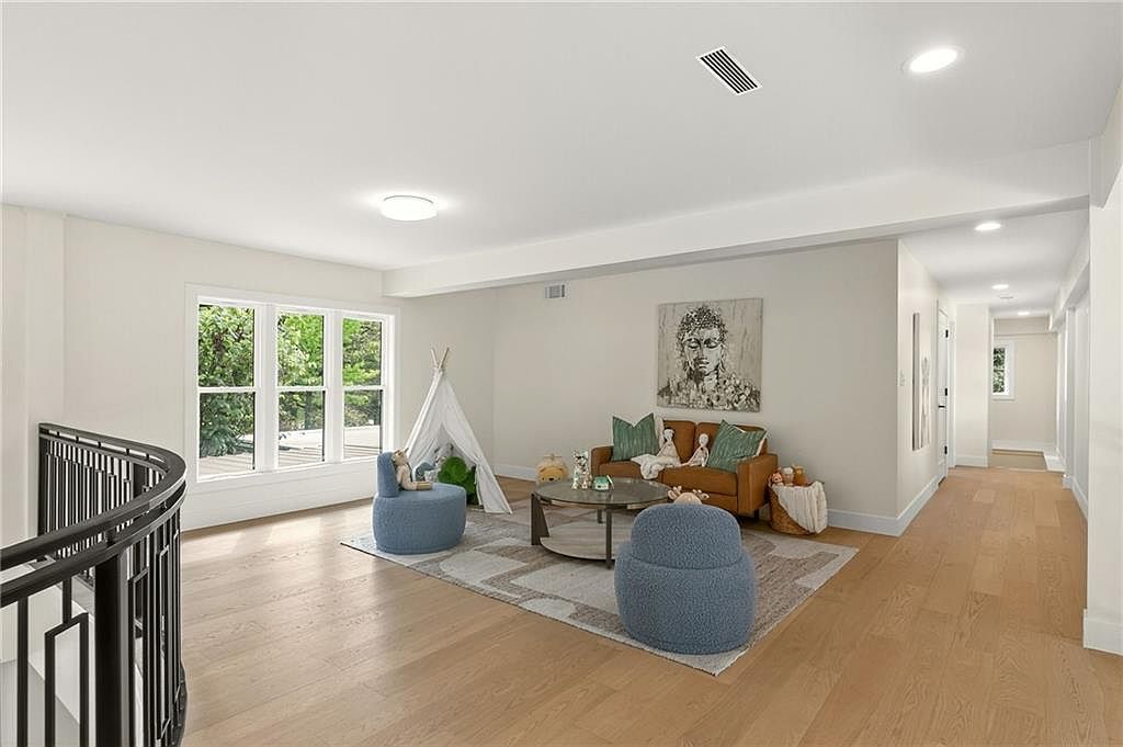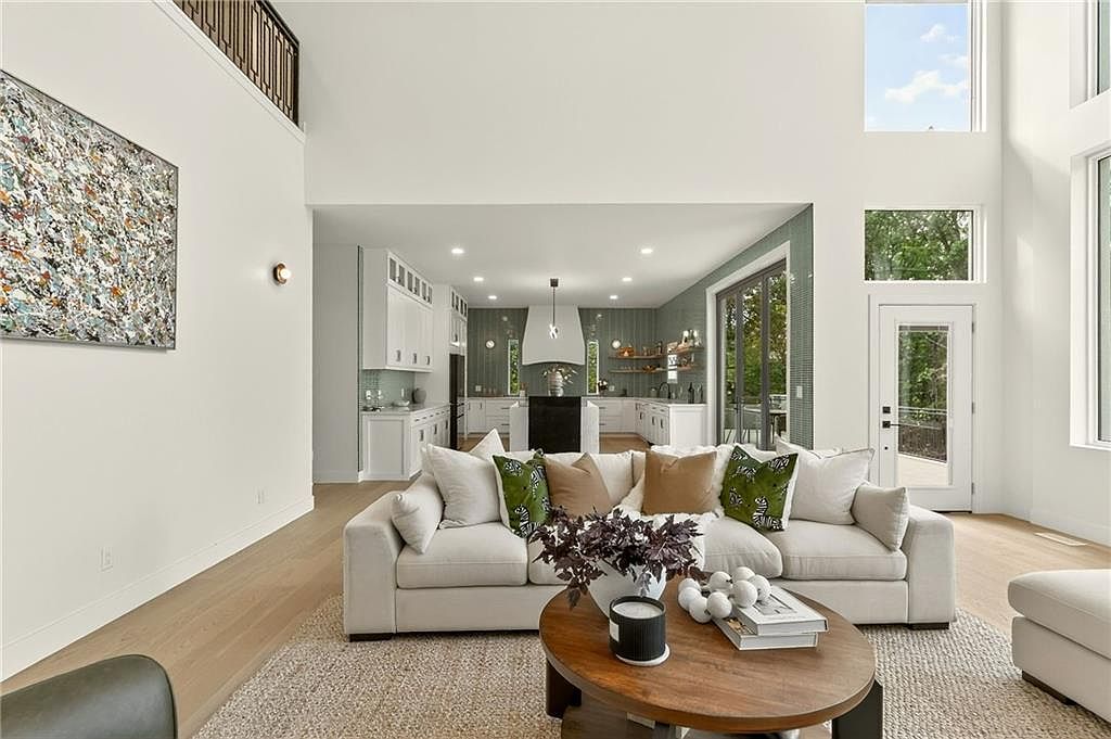 This spacious living room features an open concept design, seamlessly blending with the adjacent kitchen. Tall windows flood the area with natural light, highlighting the soft color palette of whites and earthy tones. A cozy sectional sofa, adorned with plush pillows, invites relaxation, while a rustic round coffee table adds warmth and character. The textured area rug enhances comfort underfoot, complementing the light wood flooring. Architectural details include high ceilings and sleek modern lighting fixtures, creating an airy atmosphere. The space is both family-friendly and stylish, perfect for gatherings or quiet evenings, with easy access to the outdoor deck.
