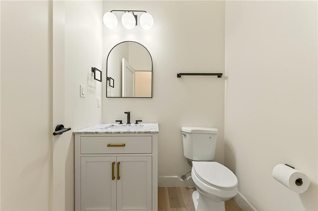 This contemporary bathroom features a sleek and functional layout, designed for modern living. The vanity boasts a stunning white marble countertop, accented by black fixtures that create a striking contrast. A large arched mirror enhances the sense of space, reflecting the chic, minimalist aesthetic. Soft, neutral wall colors make the room feel airy and inviting, while polished wooden flooring adds warmth. A simple but stylish towel bar and a toilet paper holder maintain the clean lines throughout. The well-placed lighting fixture above the mirror provides ample illumination, making it a perfect family-friendly space for daily routines.