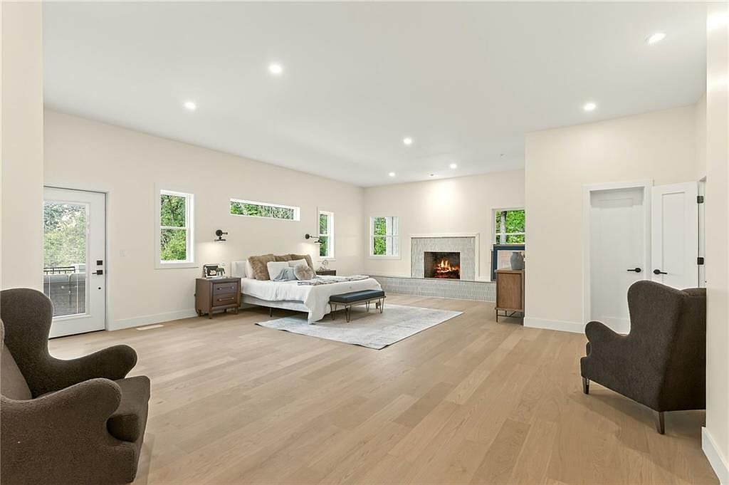 This expansive master bedroom offers a serene retreat with ample natural light streaming through strategically placed windows. The transitional design combines modern elements with cozy touches, featuring a tasteful color palette of soft whites and warm wood tones. A plush area rug anchors the spacious layout, complementing the stylish bed adorned with inviting linens. The corner fireplace creates a welcoming focal point, perfect for relaxation. Storage solutions are seamlessly integrated, with a discreet closet and functional side tables. Family-friendly furnishings, including comfortable accent chairs, invite shared moments, while the outdoor access extends the living space for tranquil mornings.