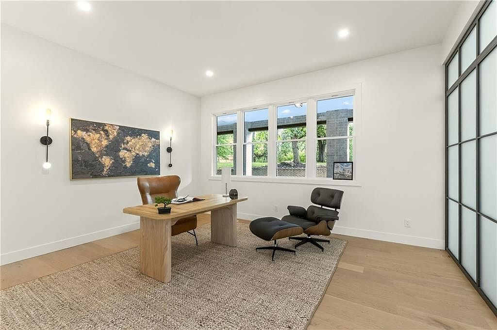 Bright and airy home office designed for productivity and comfort. Neutral white walls are complemented by warm wooden accents, creating an inviting atmosphere. A sleek, large wooden desk serves as the focal point, paired with a stylish leather chair for a touch of sophistication. Large windows offer natural light and picturesque views, enhancing the tranquil workspace. A cozy rug beneath adds warmth, while contemporary wall sconces provide subtle illumination. The mix of modern furniture and a touch of artwork featuring a world map evokes a sense of exploration, making this space perfect for both work and creativity.