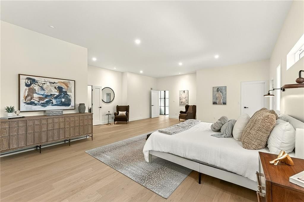 This spacious master bedroom features a modern aesthetic with high ceilings and an open layout, creating a sense of tranquility. The neutral color scheme of soft whites and grays is complemented by warm wooden flooring, adding warmth to the space. A plush, oversized bed adorned with cozy throws and accent pillows invites relaxation. Elegant artwork brings personality to the walls, while a stylish wood side table and a mid-century modern dresser enhance functionality. Ample natural light floods in through the large windows, ensuring a bright and airy feel, perfect for a family-friendly retreat.