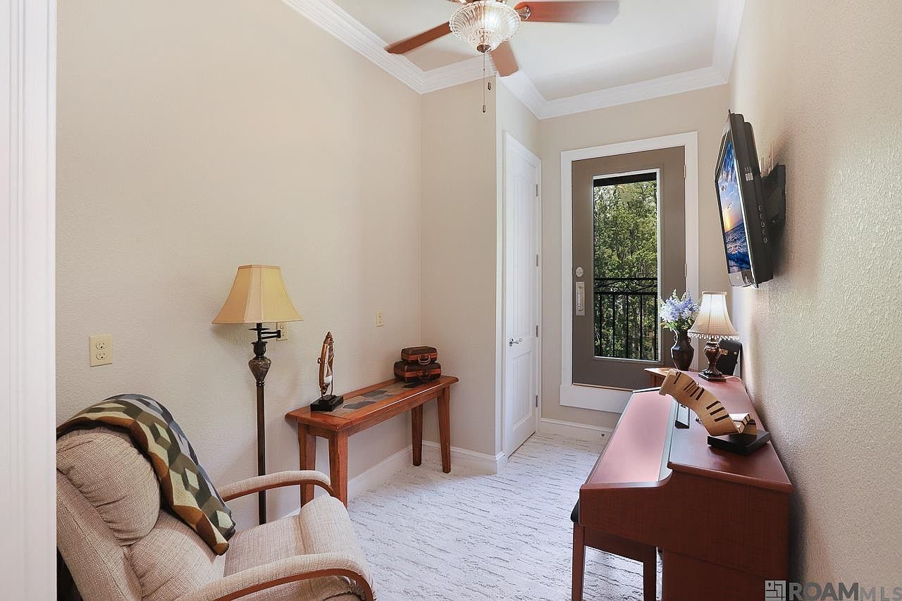 A tranquil reading corner is thoughtfully designed with warm neutral tones and abundant natural light streaming in through a glass door that leads to a petite balcony overlooking lush greenery. The space features an inviting armchair draped with a soft-patterned throw, a vintage wooden side table topped with a classic lamp, and a slim console table accented with artistic decor. A sleek upright piano adds a creative touch, accompanied by a small side lamp and faux florals for a homey atmosphere. Crown molding, plush carpeting, and a ceiling fan complete the family-friendly, soothing ambiance, ideal for relaxation or quiet study.