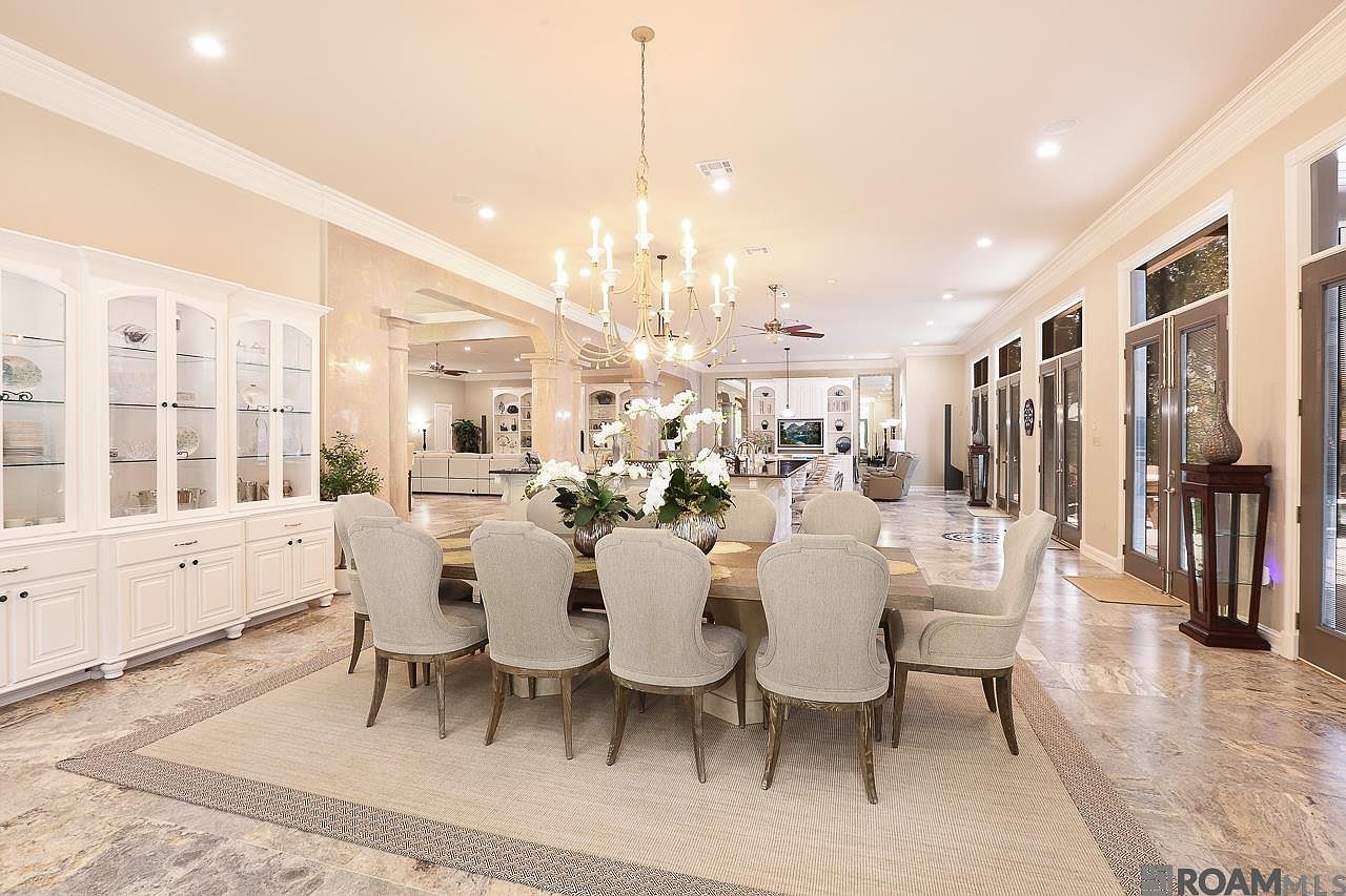 Expansive open concept space seamlessly blends a gourmet kitchen, multiple dining areas, and a cozy living room. The room features polished marble floors, grand columns, and soft neutral tones accented by elegant crown molding and archways. A large kitchen island with bar seating welcomes casual family meals, while a formal dining area enjoys plentiful natural light through French doors. The breakfast nook and intimate round table further enhance family-friendly dining options. Comfortable upholstered chairs, contemporary lighting, and plush sofas foster a relaxed yet refined ambiance perfect for gatherings. This thoughtfully designed space is ideal for both entertaining and daily family living.