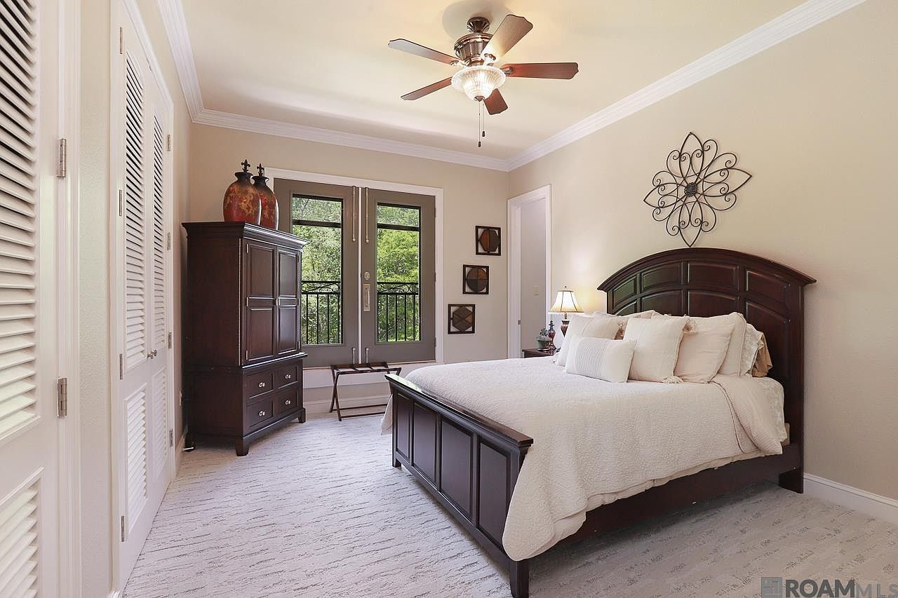 A spacious, family-friendly bedroom featuring a large, dark wood bed accented by plush white linens and coordinating pillows. The matching dresser and nightstand add elegance, while double French doors bring in abundant natural light and offer a peaceful view of greenery outside. Soft neutral walls, subtle crown molding, and a stylish metal wall sculpture create a tranquil, sophisticated ambiance. The ceiling fan adds comfort for all seasons, and the carpeted floor enhances warmth and safety for children. The layout ensures ample space for relaxation, making it an inviting haven for restful nights and quiet mornings alike.