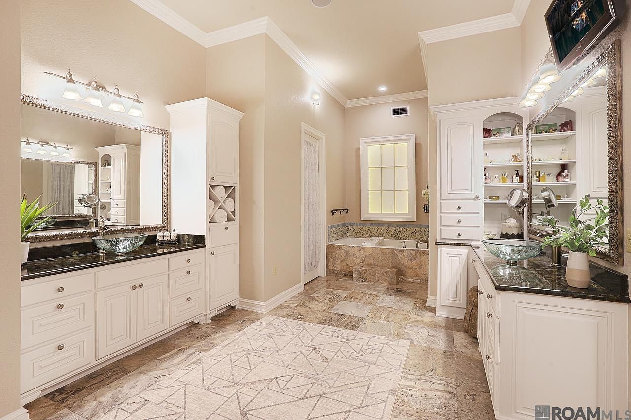 Luxurious master bathroom designed with family comfort in mind, featuring a spacious double vanity with elegant glass vessel sinks and abundant storage space for essentials. The layout offers practical organization with rolled towel shelving, under-counter cabinetry, and open shelving to keep toiletries within reach. A large built-in soaking tub is set against natural stone tiling, creating a serene spa-like atmosphere. Neutral beige and white tones blend seamlessly with marble-patterned floors and dark granite countertops, while crown molding, soft lighting, and decorative mirrors add sophistication. A plush geometric rug softens the space, making it inviting for adults and safe for children.