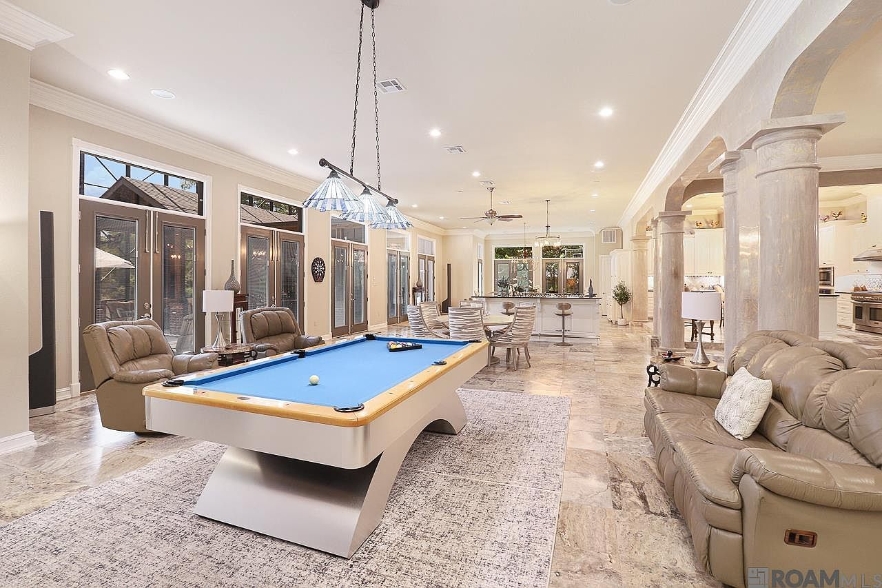 An inviting open-plan family game room features a stylish blue pool table as its centerpiece, surrounded by plush tan leather recliners and a matching sofa perfect for relaxation and conversation. Expansive windows and glass doors allow natural light to fill the space, complementing the soft neutral tones and polished marble flooring. The seamless flow to a dining area and kitchen underlines family-friendly living, encouraging gatherings and play. Decorative columns, tasteful lighting, and a broad area rug add sophistication, while the spacious layout ensures comfort and accessibility for guests of all ages.