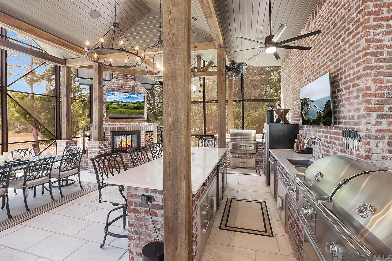 A spacious screened-in patio blends rustic charm and modern convenience with exposed brick walls, large wooden beams, and a vaulted ceiling. The layout encourages gatherings, featuring an expansive dining table with cushioned seating for eight and a sleek counter bar with high-backed metal stools. The space includes a gourmet grilling station, ample marble countertops, and stainless steel appliances for effortless entertaining. A double-sided brick fireplace adds coziness and serves as a focal point, complete with a mounted television for family movie nights. Light, neutral-toned flooring, ample windows, and chandeliers create an inviting environment perfect for indoor-outdoor living.
