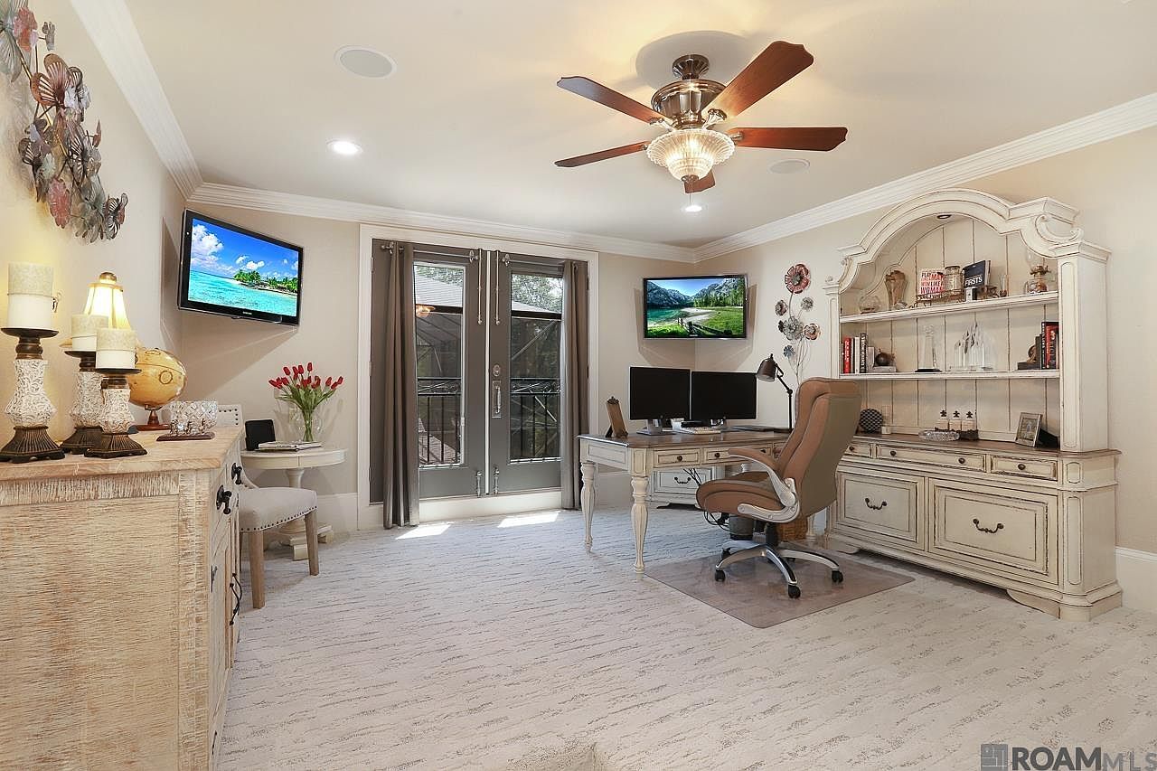 An inviting home office nook featuring built-in white bookshelves, ample cabinet storage, and a classic wooden desk set the tone for productivity and comfort. The neutral color palette of soft ivory and beige creates a calm, bright atmosphere, complemented by crown molding and recessed lighting throughout. The central ceiling fan provides gentle airflow, ensuring the space remains comfortable for long work or study sessions. Family photos, curated books, and decorative accents offer a personalized touch, making this office feel like an extension of the living space. The open layout and carpeted floor are ideal for families, providing a safe and welcoming environment.