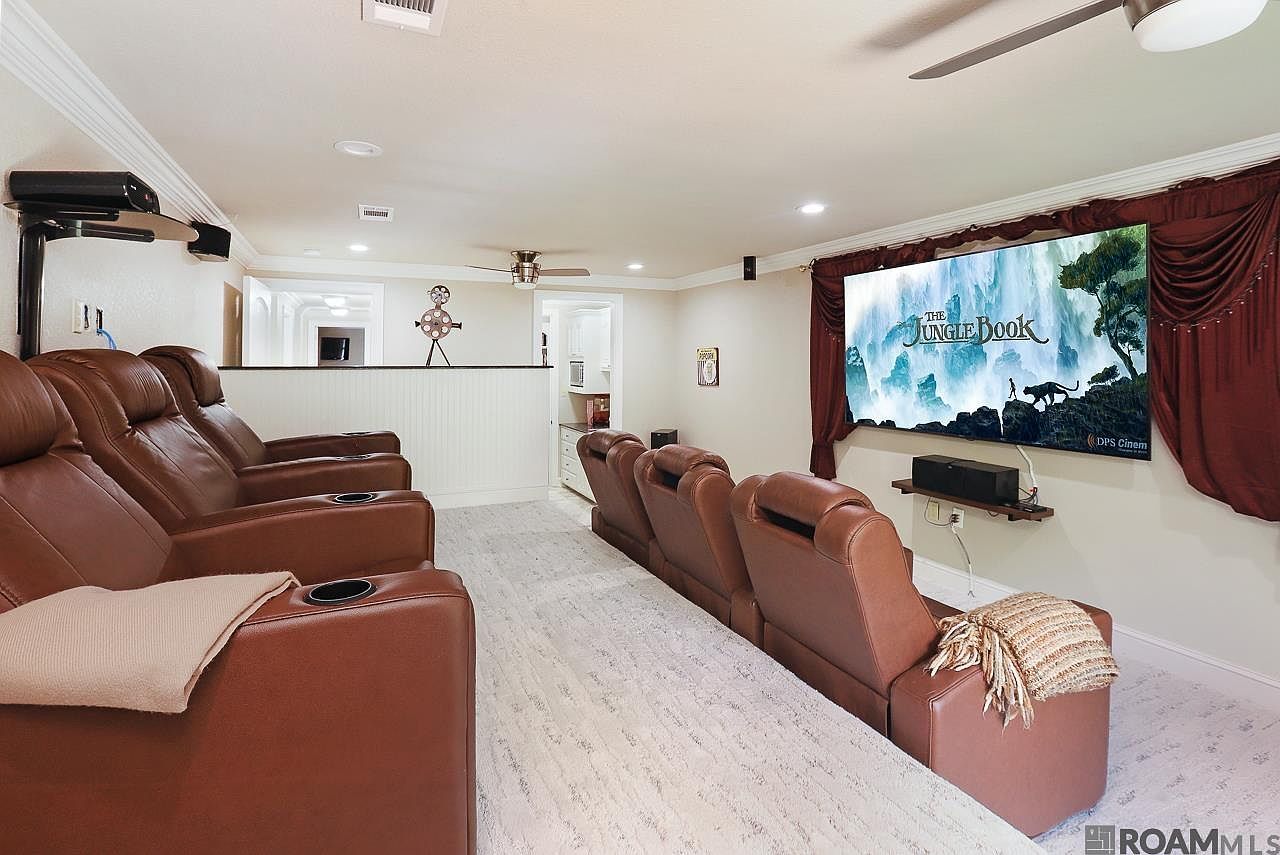 This inviting home theater boasts two rows of plush, brown leather recliners, complete with built-in cup holders, offering ultimate comfort for family movie nights. A large flat-screen television takes center stage, framed by dramatic, deep-red drapery for an authentic cinema atmosphere. Neutral walls and soft, light carpeting enhance the cozy feel, while recessed ceiling lights and a sleek ceiling fan add practical touches. The open entryway and adjacent space ensure easy access for all ages, making it perfectly family-friendly. Subtle movie-themed décor and excellent sightlines create a warm, immersive entertainment space for everyone to enjoy together.