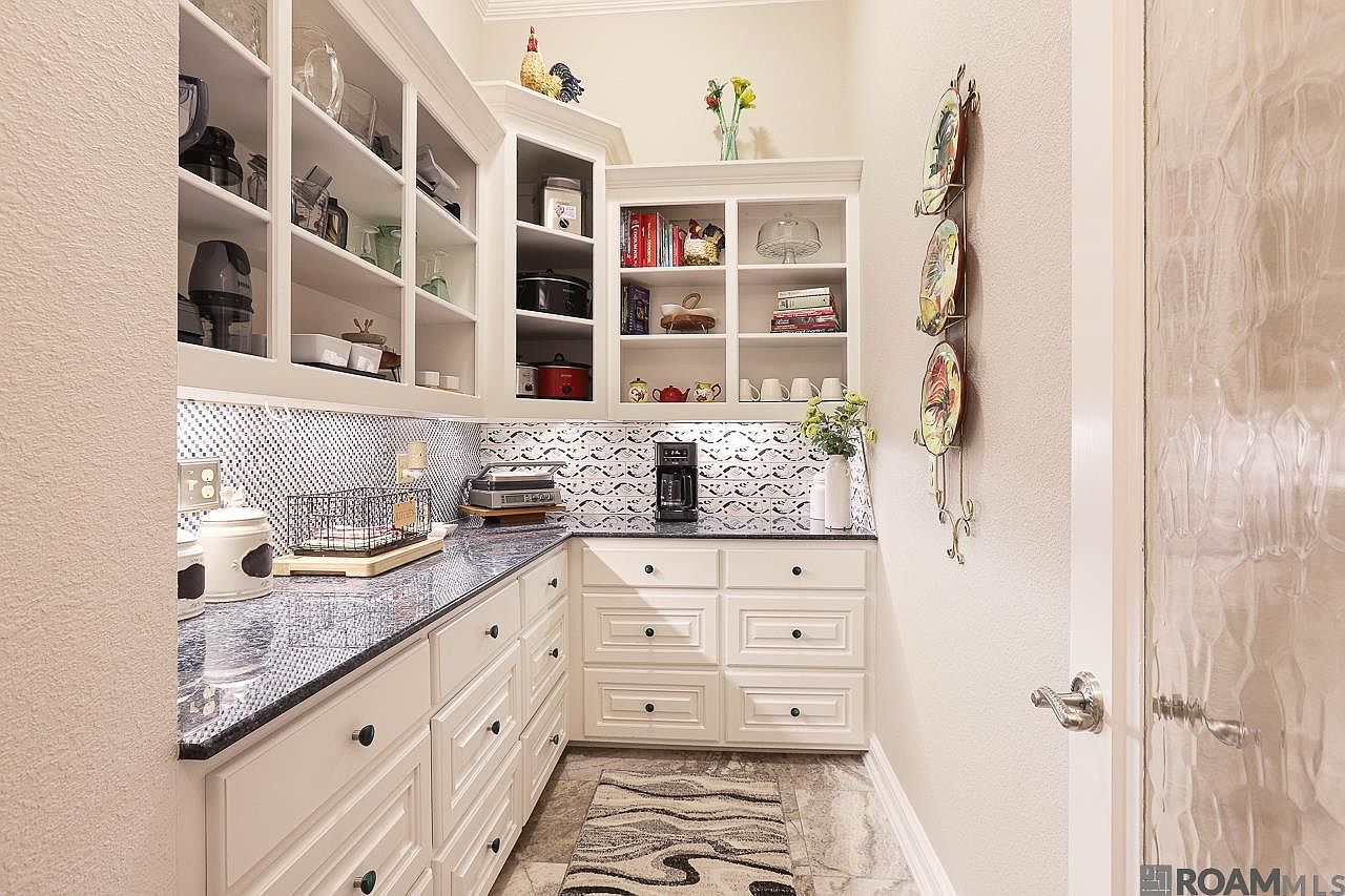 This butler’s pantry features an L-shaped layout with elegant white cabinetry, glass-front upper shelves, and polished granite countertops that offer ample workspace. The open shelving displays practical kitchenware and cookbooks, while under-cabinet lighting enhances both functionality and ambiance. A stylish monochrome backsplash adds visual interest and complements the neutral wall tones. Family-friendly elements include abundant storage for small appliances and kid-accessible lower drawers. Decorative wall plates and fresh flowers provide a welcoming touch, and the plush runner softens the tile flooring, making this a perfect transitional space for meal prep or serving gatherings in a busy family home.