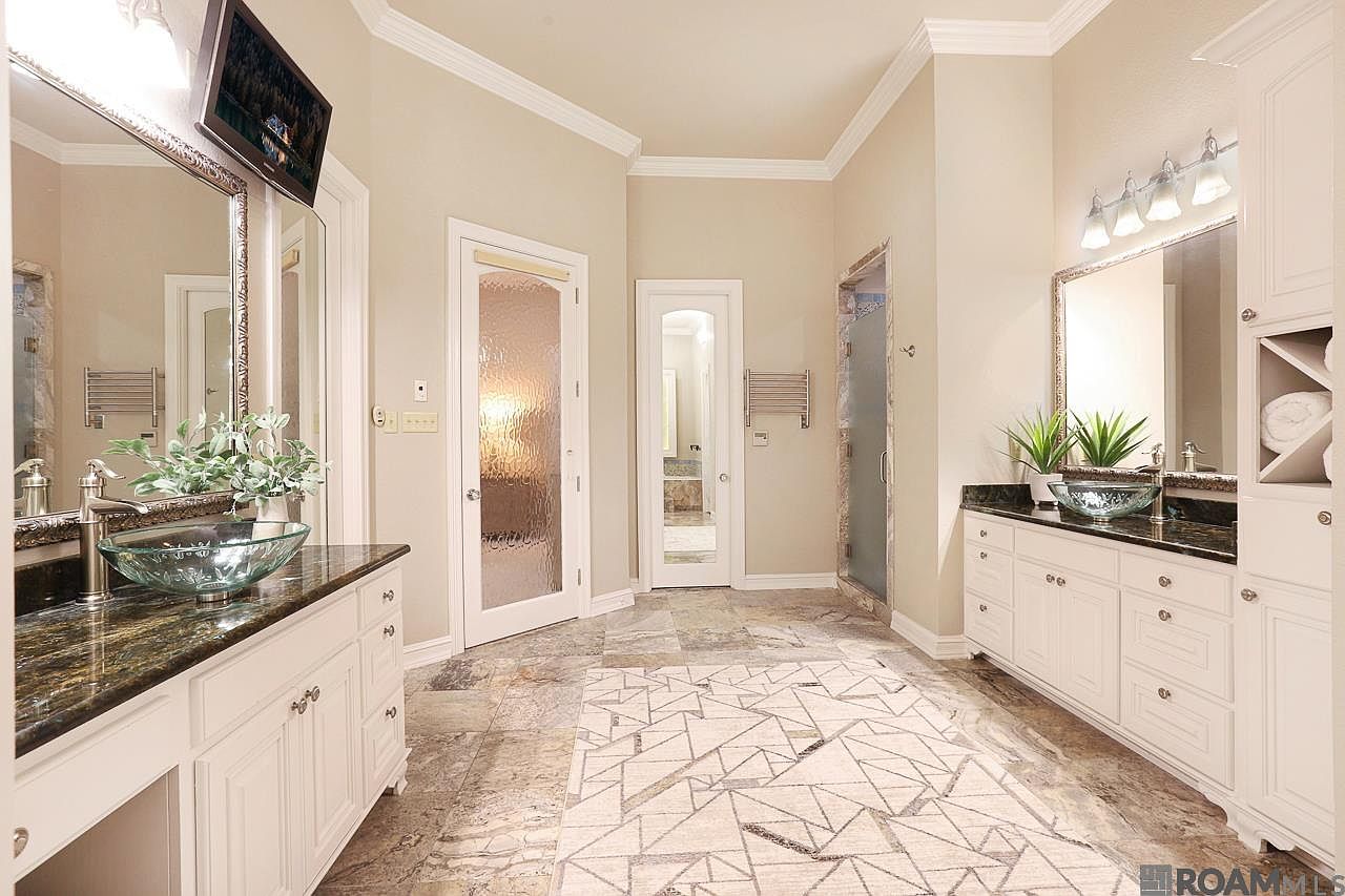 Spacious master bathroom featuring dual granite-topped vanities with sleek vessel sinks and large framed mirrors, offering plenty of space for a couple’s daily routines. Warm neutral tones on the walls and cabinetry contribute to a calming atmosphere, while the patterned area rug softens the natural stone tile floor underfoot. Frosted glass doors provide privacy to adjoining spaces, and open shelving with rolled towels makes the bathroom family friendly and practical. Contemporary lighting fixtures, touches of greenery, and crown molding add elegance while ensuring the room feels bright, open, and welcoming for a busy household.