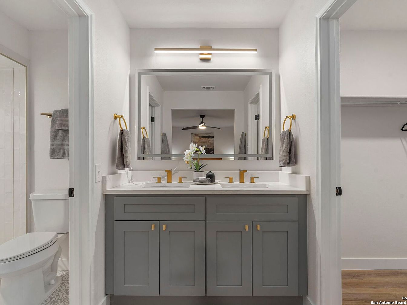 This elegantly designed bathroom combines functionality with modern aesthetics. The layout features a dual vanity with gray cabinetry accented by gold hardware, providing ample storage. A large mirror is illuminated by sleek lighting, enhancing the sense of space. The soft gray and white color scheme creates a serene atmosphere, complemented by plush gray towels hanging stylishly. The shower area showcases contemporary tiles, while a subtle decorative touch of greenery adds warmth to the space. With well-placed lighting fixtures and a tidy layout, this bathroom serves as a perfect family-friendly retreat, balancing practicality with sophisticated style.