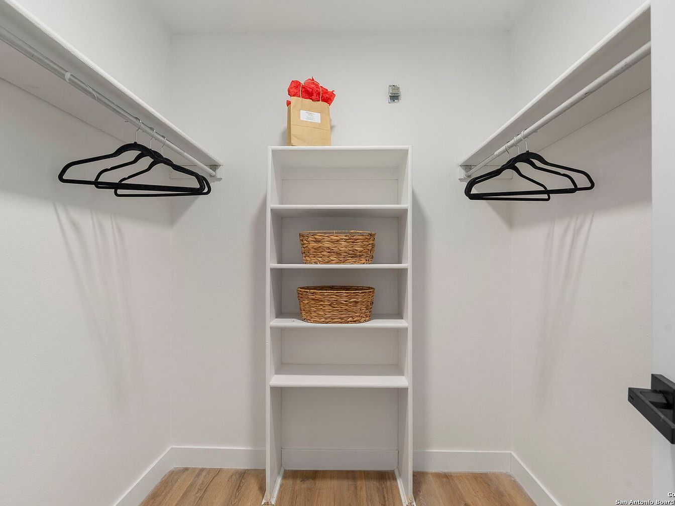 This walk-in closet exudes functionality and style, featuring a clean, minimalist design. With two sturdy hanging rods, it offers ample space for clothing organization, while the open shelf unit provides easy access to storage baskets, promoting tidy living. The bright white walls enhance the sense of space, complemented by warm wooden flooring that adds a touch of coziness. Its efficient layout is ideal for families, ensuring that everything from everyday wear to seasonal items is neatly stored away. This closet combines practicality with aesthetic appeal, making it a perfect addition to a modern home.