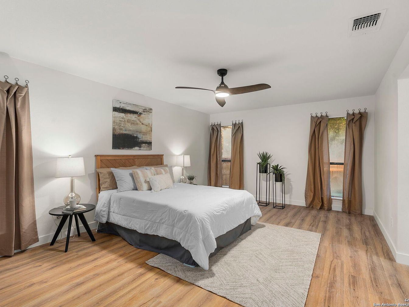 This master bedroom showcases a serene and contemporary design, ideal for relaxation. A plush king-size bed takes center stage, adorned with soft linens and decorative pillows in light hues. Earthy walnut tones complement the light-colored walls and warm wood flooring, creating a welcoming ambiance. Large windows adorned with elegant taupe drapes allow natural light to flood the space, enhancing its airy feel. Modern ceiling fans and minimalistic bedside tables add functionality and style. Potted greenery in stylish planters introduces a touch of nature, while the subtle artwork above the headboard ties the room together, providing a tranquil escape.