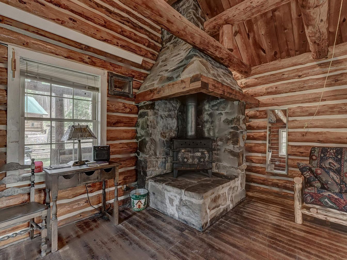 A cozy corner features a large, stone fireplace with a vintage wood-burning stove, perfect for family gatherings on chilly evenings. Natural log walls and exposed timber beams create a warm, inviting atmosphere while the high ceiling adds to the spaciousness. A small desk sits beside a window allowing in plenty of natural light, making it a perfect spot for homework or creative projects. The space is decorated in earthy tones, with sturdy wooden furniture and a patterned armchair, reflecting a family-friendly, rustic aesthetic. This setting offers both comfort and charm, ideal for relaxation or enjoying time with loved ones.