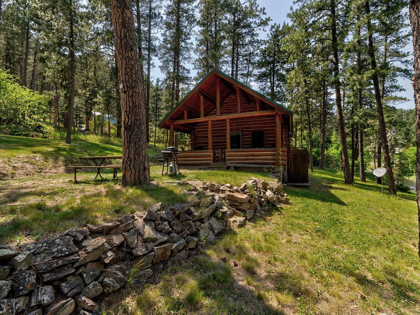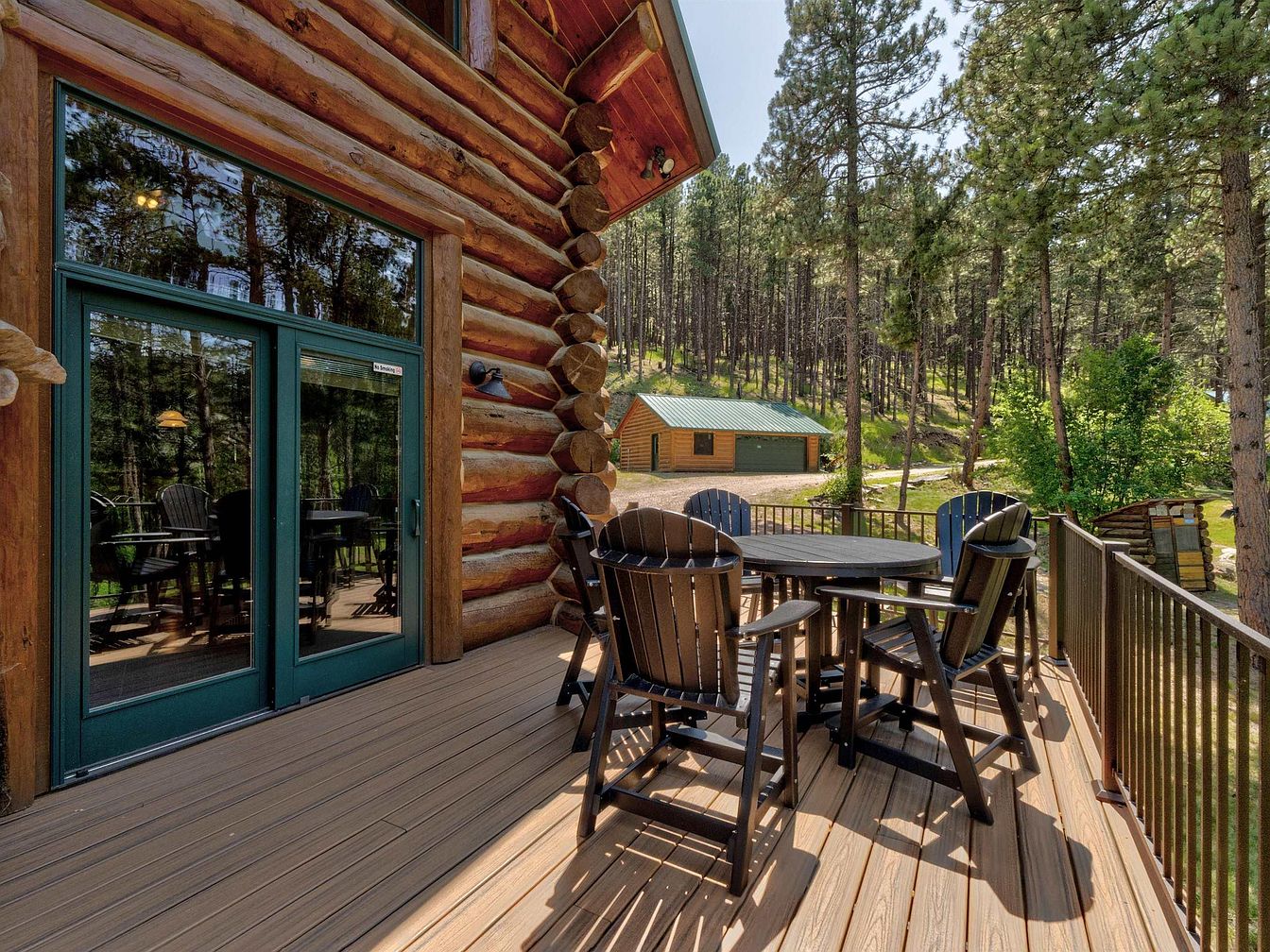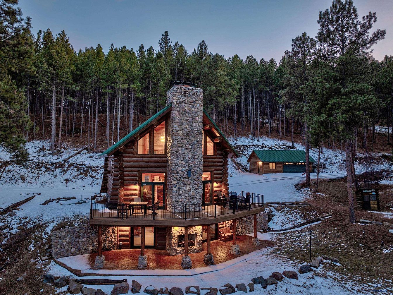 Nestled above Rapid Creek near Rapid City, SD, this stunning custom log home, constructed with imported Canadian logs, effortlessly blends status appeal, historical craftsmanship, and modern luxury, making it ideal for a success-driven, future-oriented homeowner. With over 2,800 square feet of living space on a sprawling 3+ acre wooded plot, both the main residence and the guest cabin feature expansive windows, cozy fireplaces, and elegant outdoor entertaining spaces. The architectural style pays homage to classic log homes, evoking rustic grandeur and tranquility in the serene Black Hills. Priced at $1,500,000, this property offers unmatched investment potential, privacy, and the flexibility of multi-generational or guest accommodations, delivering a rare, prestigious lifestyle opportunity in an unbeatable natural setting.