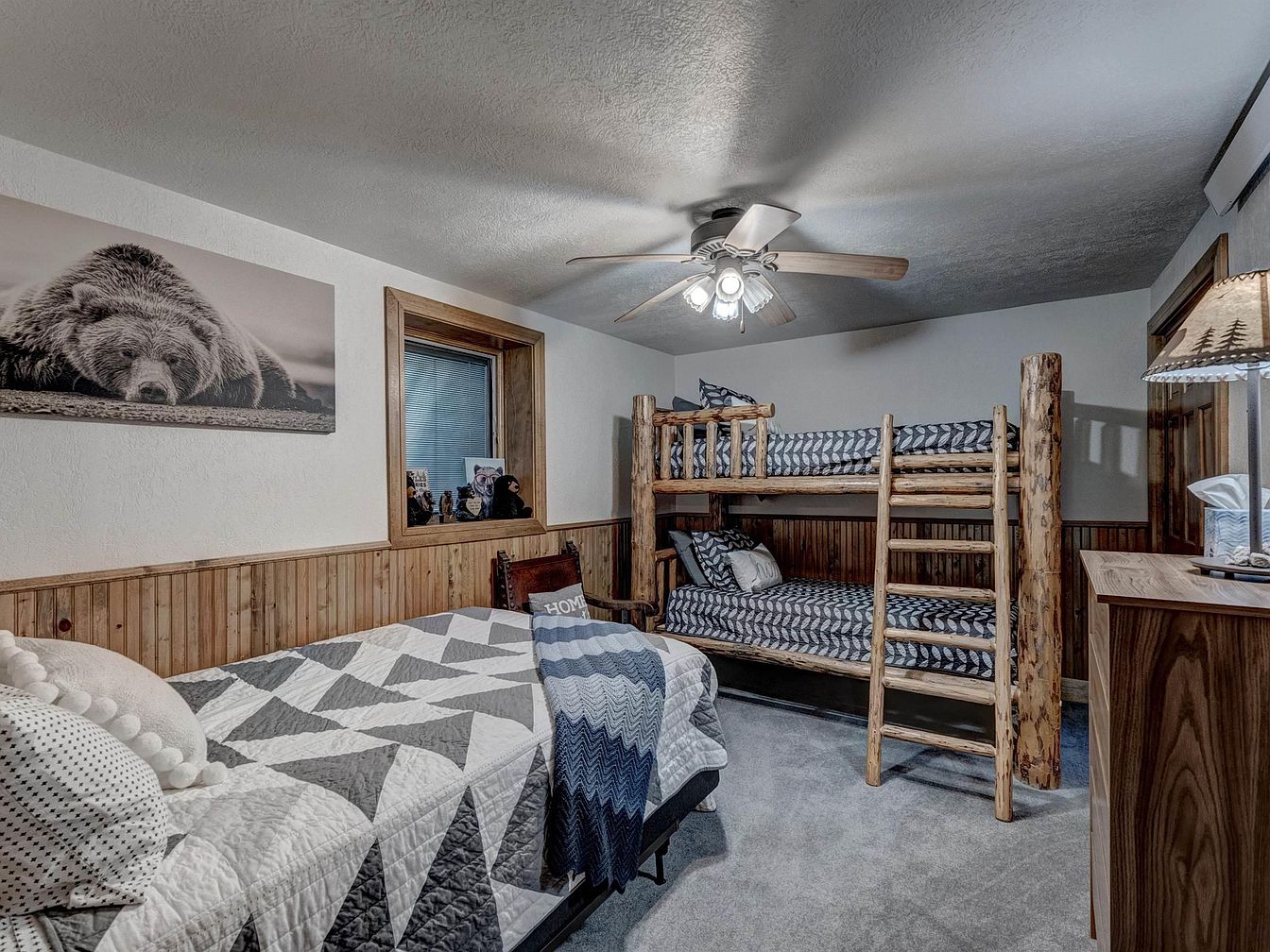 Rustic charm and cozy comfort define this inviting kid’s bunk room, where wood-paneled walls and log-style furniture evoke a warm, cabin-inspired aesthetic. The space features a sturdy twin-over-twin bunk bed and a single twin bed, both dressed in geometric patterned bedding with soft throws and accent pillows. Neutral tones of gray, white, and wood create a calming environment, while playful touches like the bear artwork and woodland-themed lamp foster creativity and a sense of adventure. The carpeted floor offers a safe, soft play area, making this room both stylish and family-friendly for children’s needs.